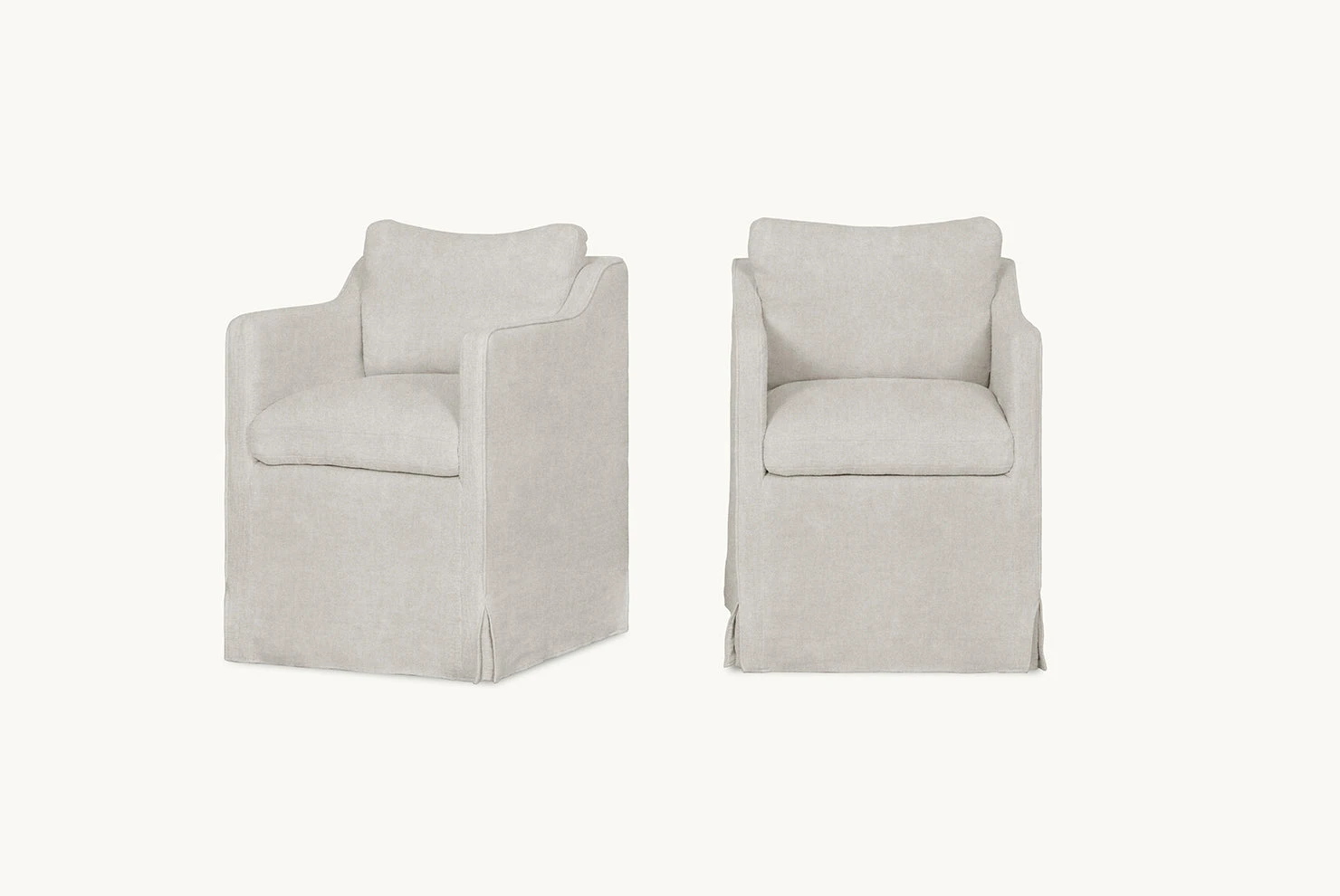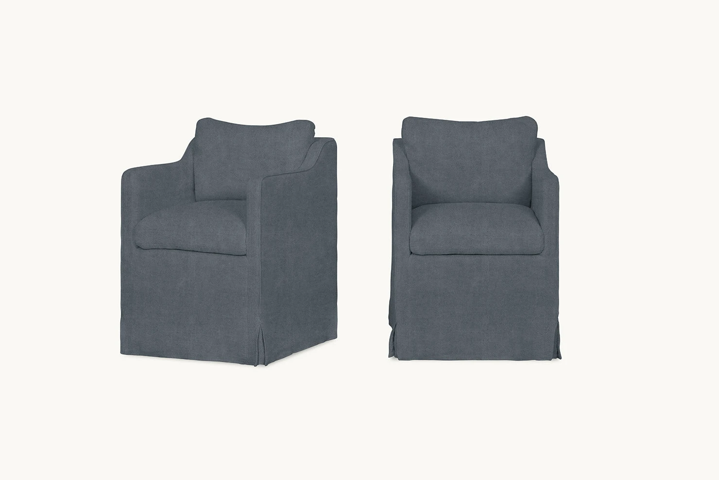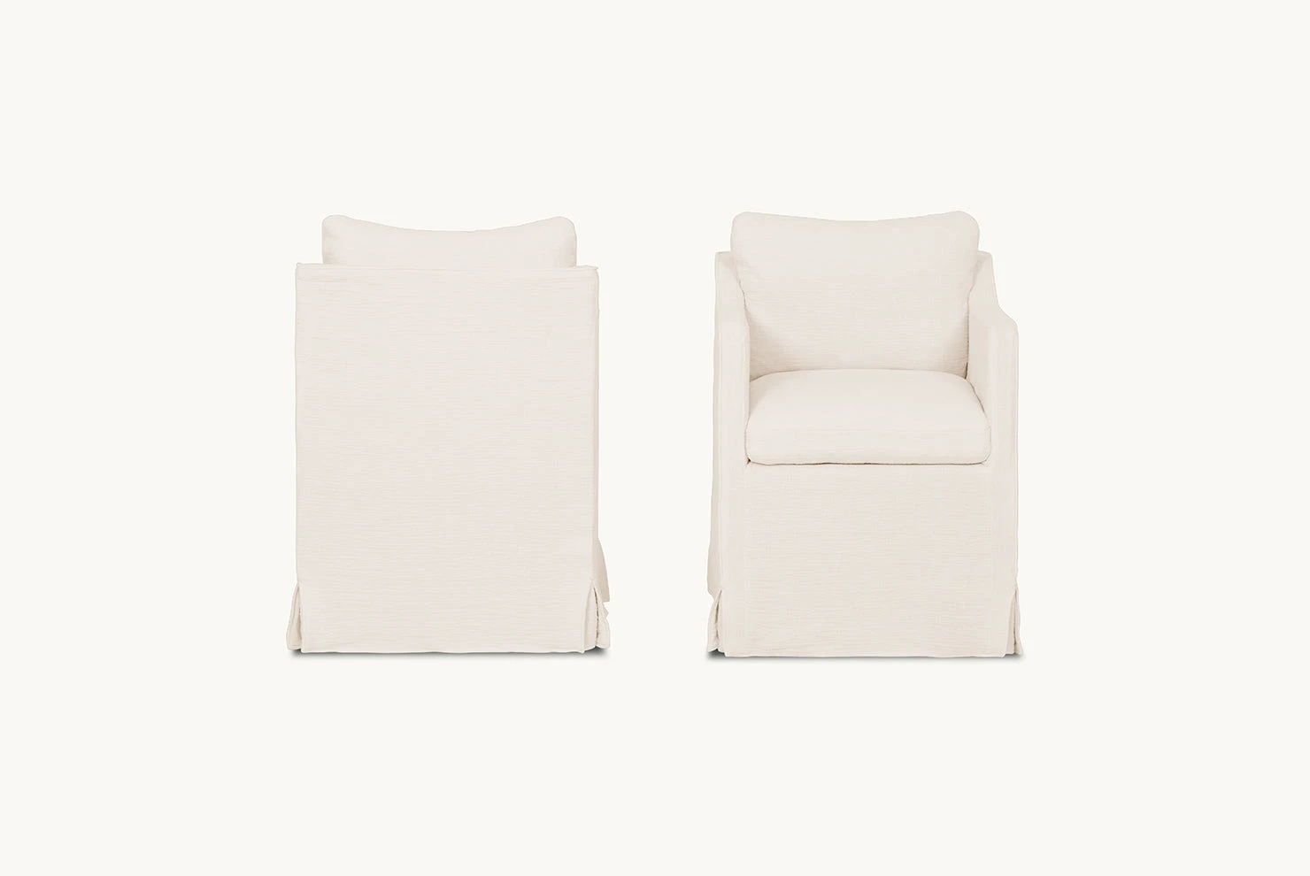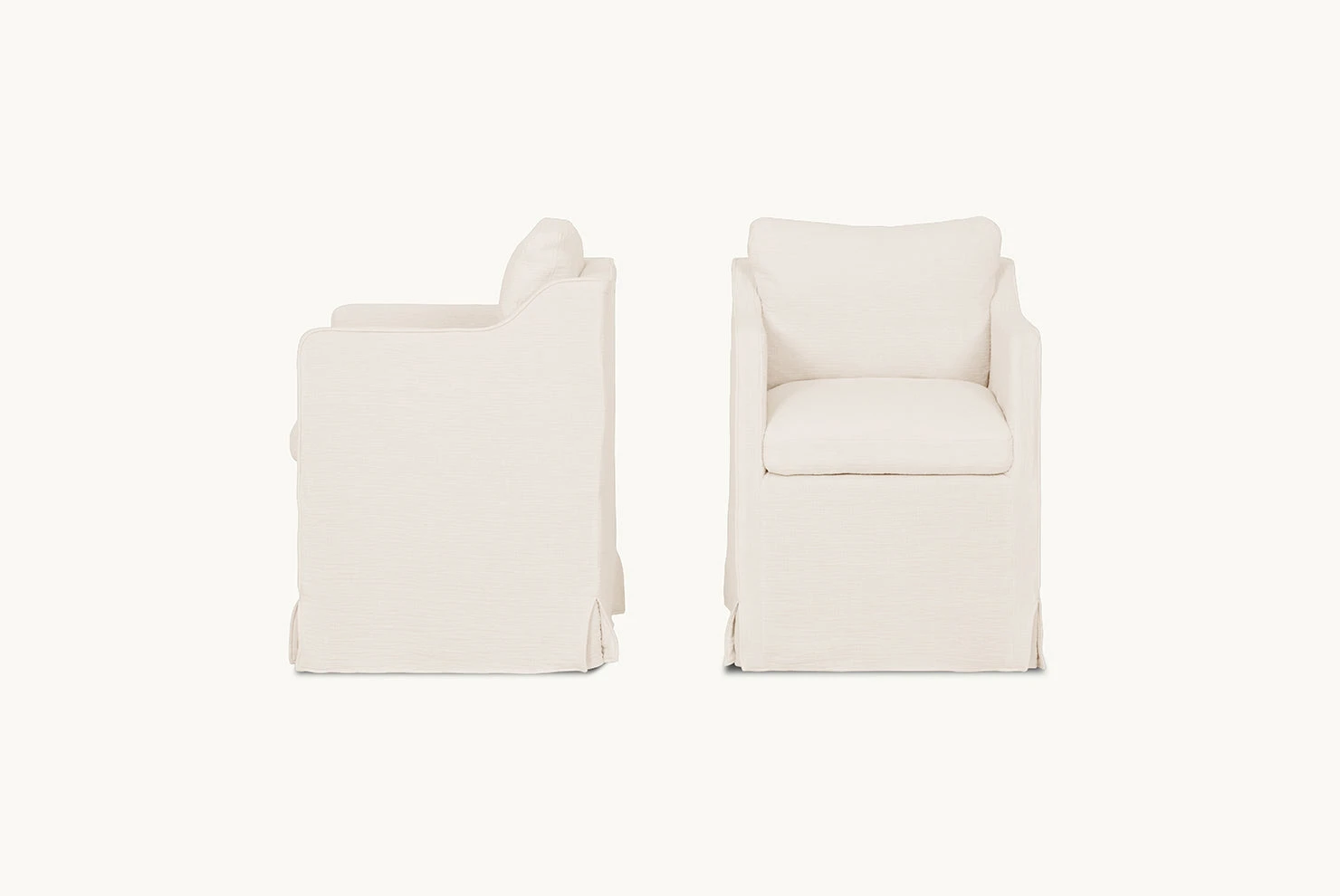A gentle slope arm for those who love blurring the line between contemporary and classic, with piped stitching and a swappable slipcover to change your dining room’s look in an instant.