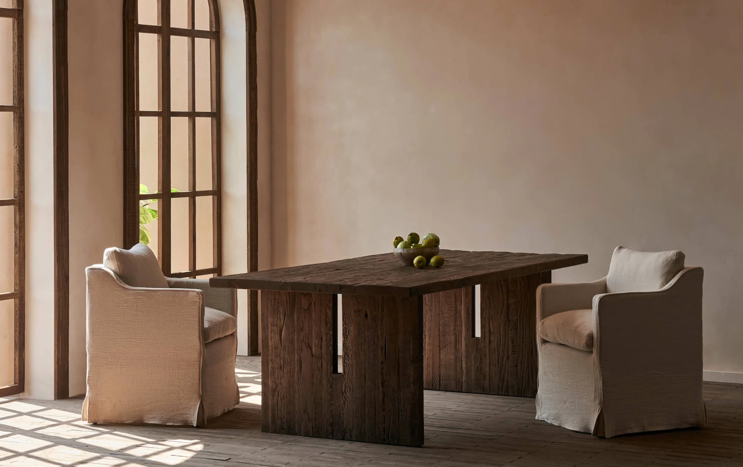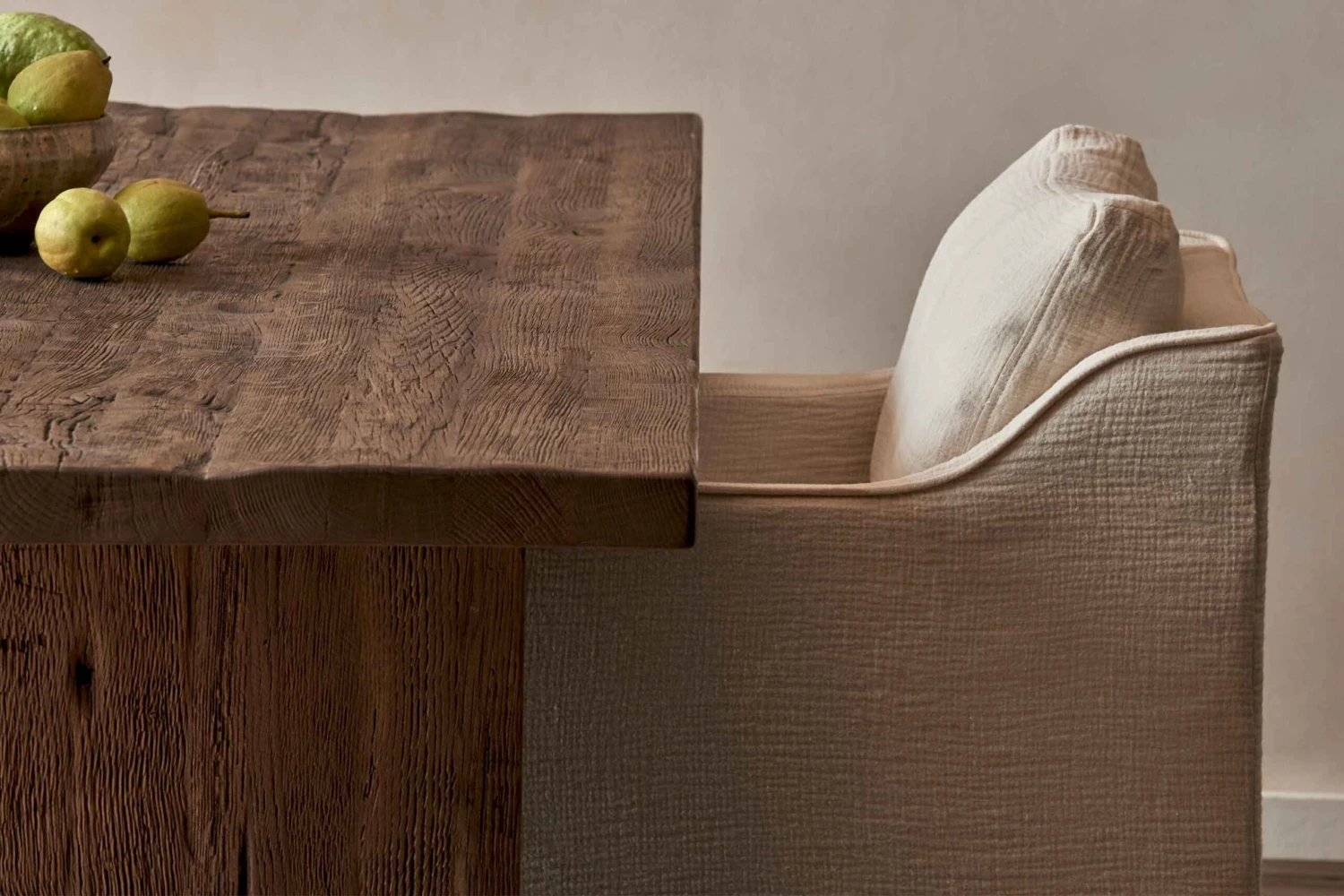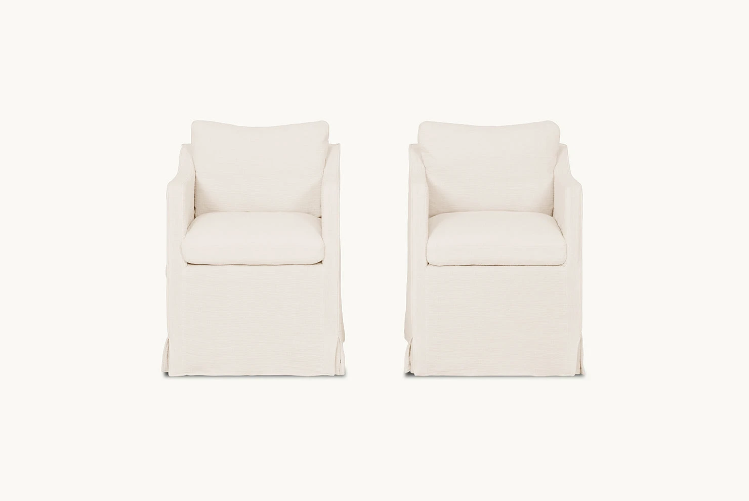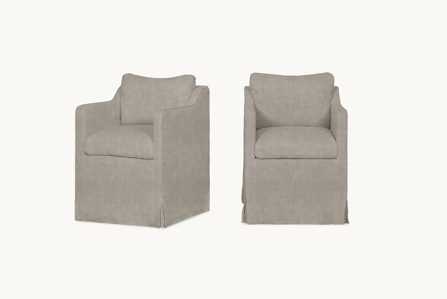 A gentle slope arm for those who love blurring the line between contemporary and classic, with piped stitching and a swappable slipcover to change your dining room’s look in an instant.