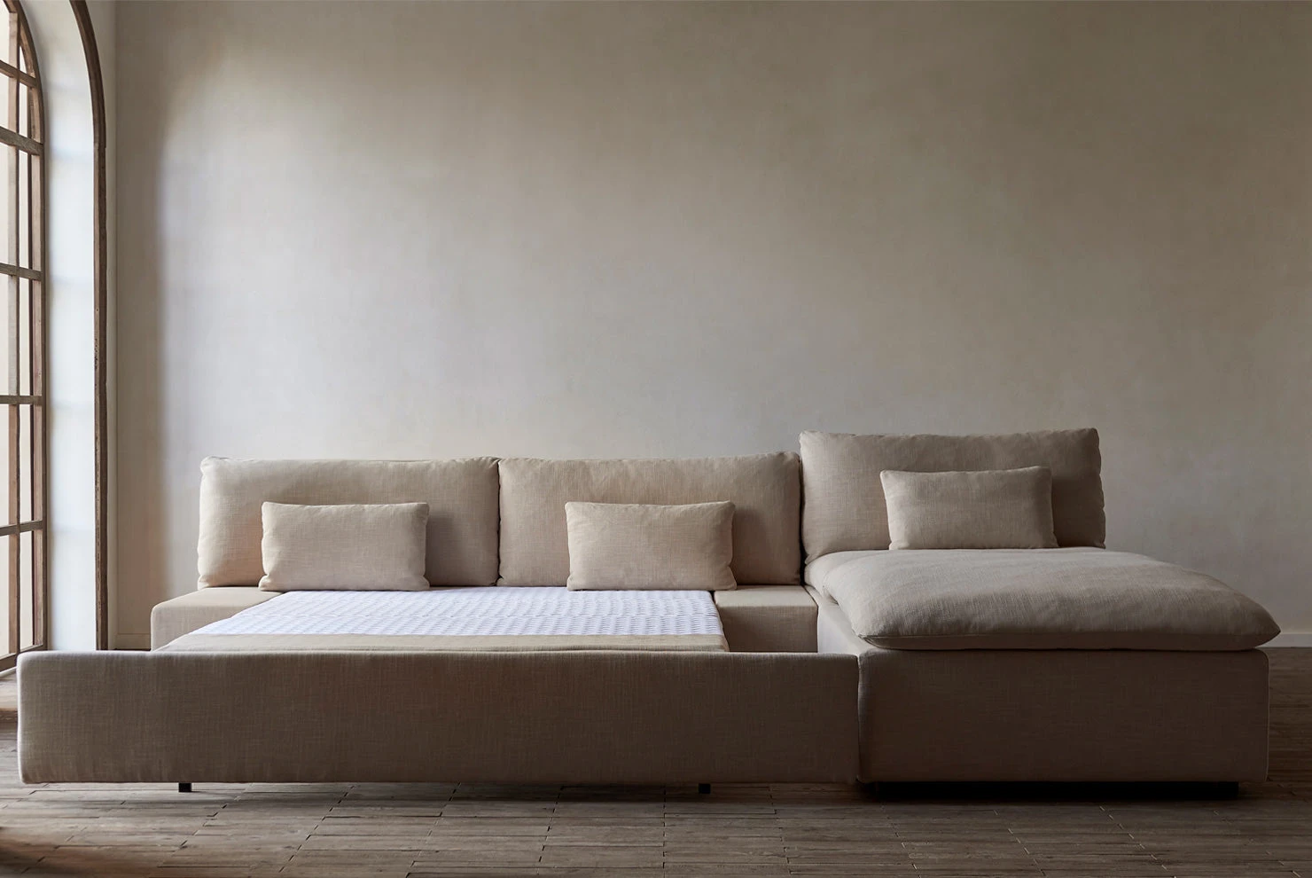 Aria’s armless design suits its fully upholstered sleeper sectional sibling perfectly. Featuring an all-natural cotton quilted, premium layered foam mattress, and built on an impressively sturdy, silky smooth tri-fold gliding frame.