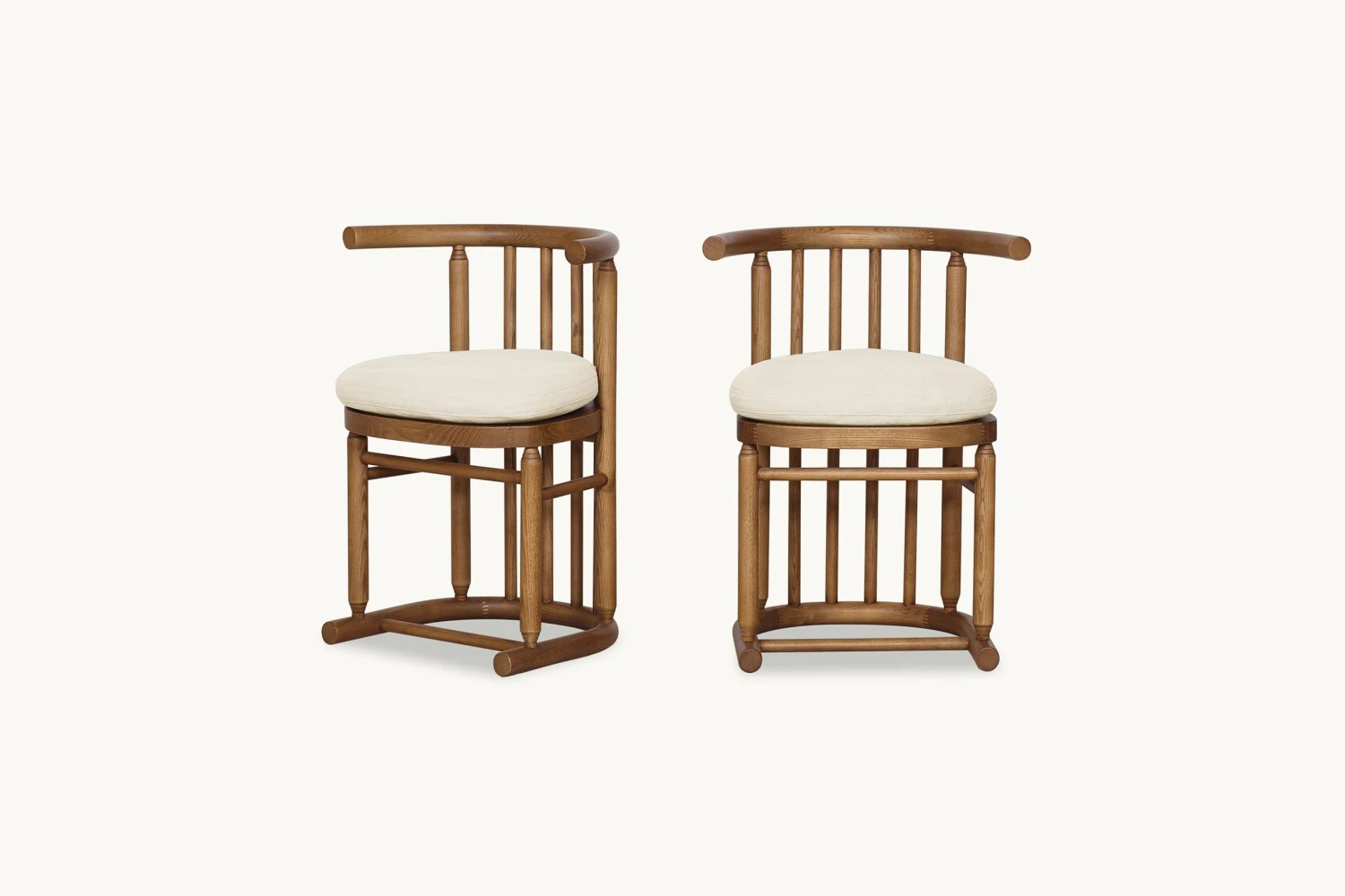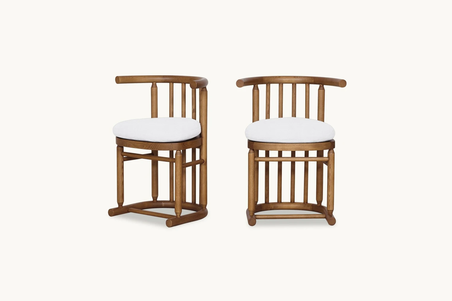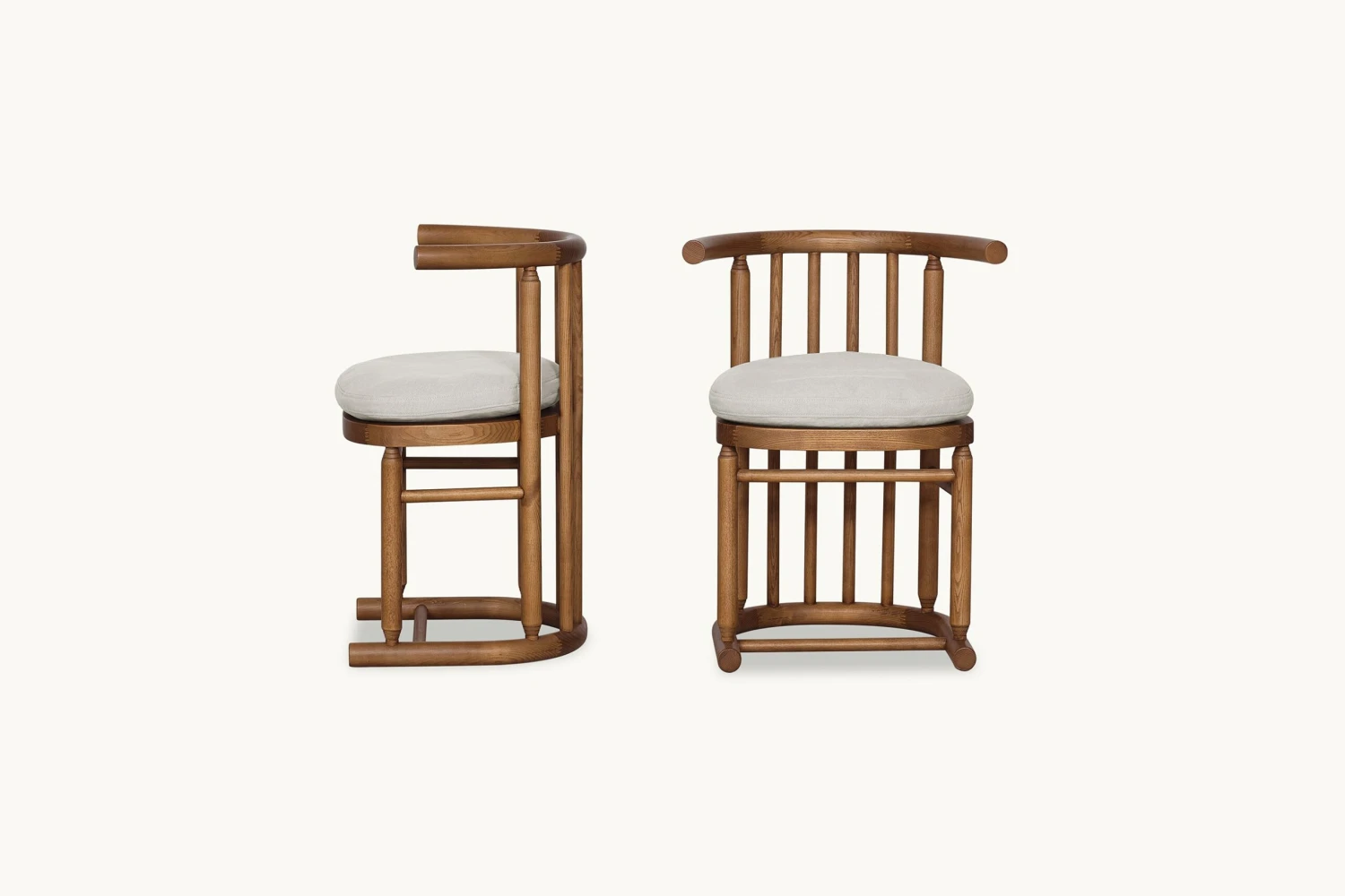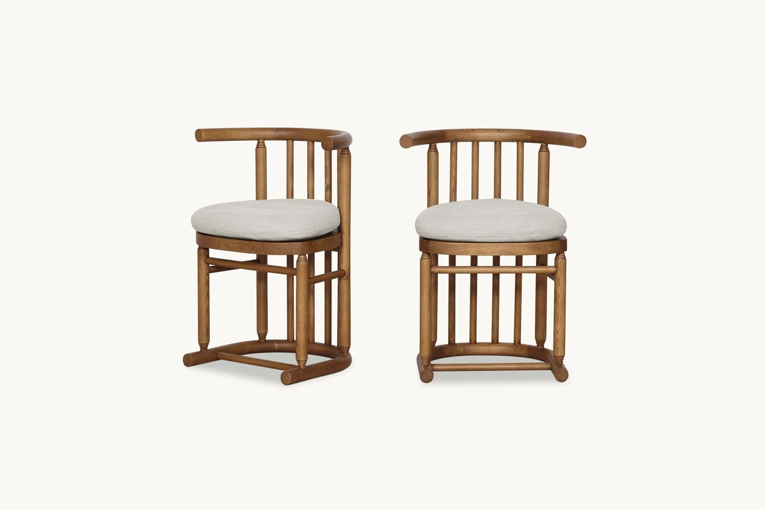 Inspired by the late Josef Hoffman’s Chair no. 729, Bene’s horseshoe top and base are vertically punctuated by rounded spindles, subtly carved at the end points and adorned with a fluffy slipcovered cushion for unexpected comfort.