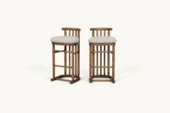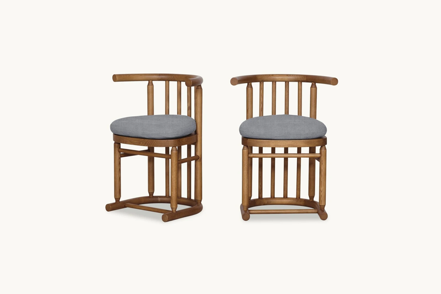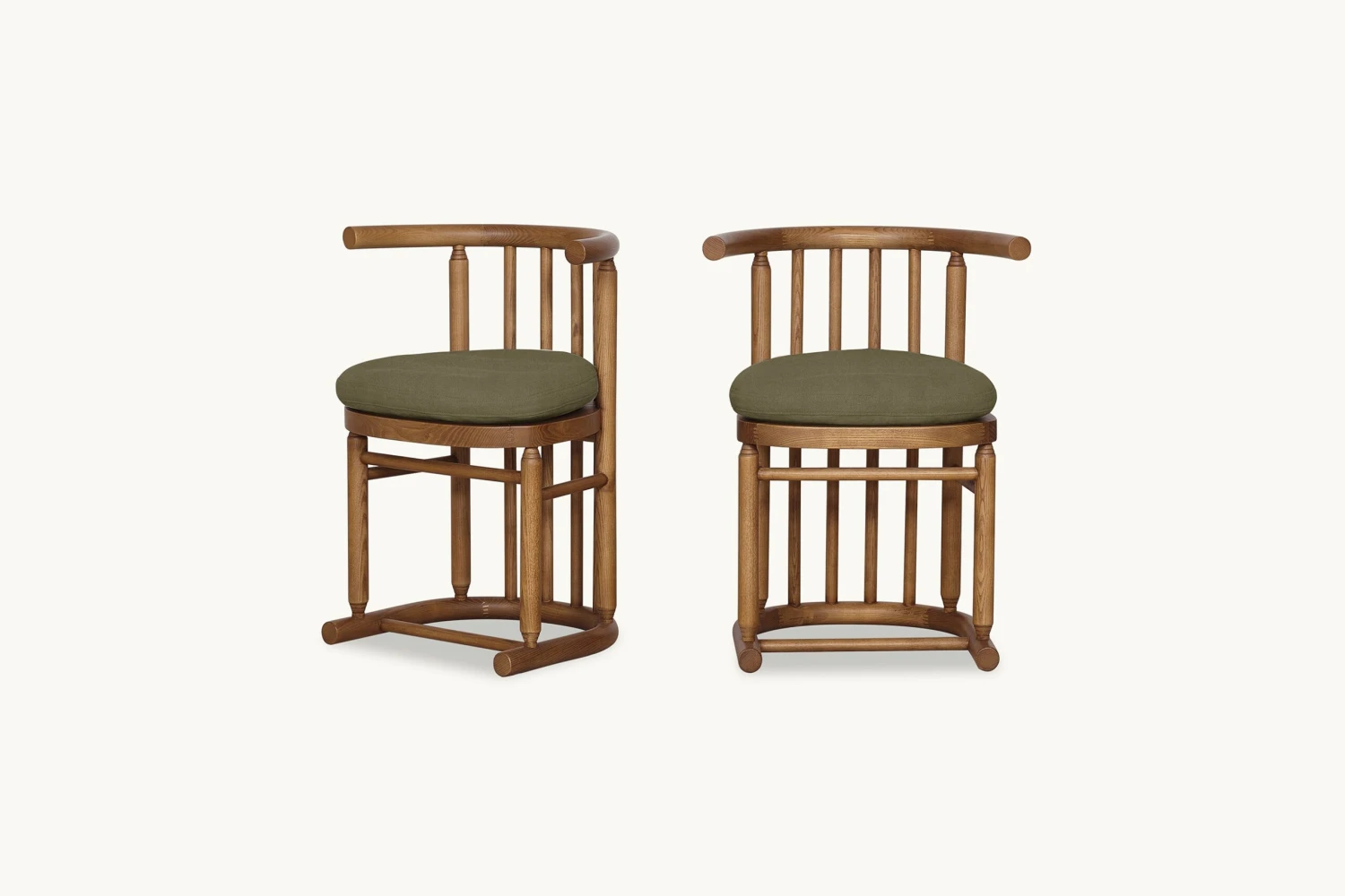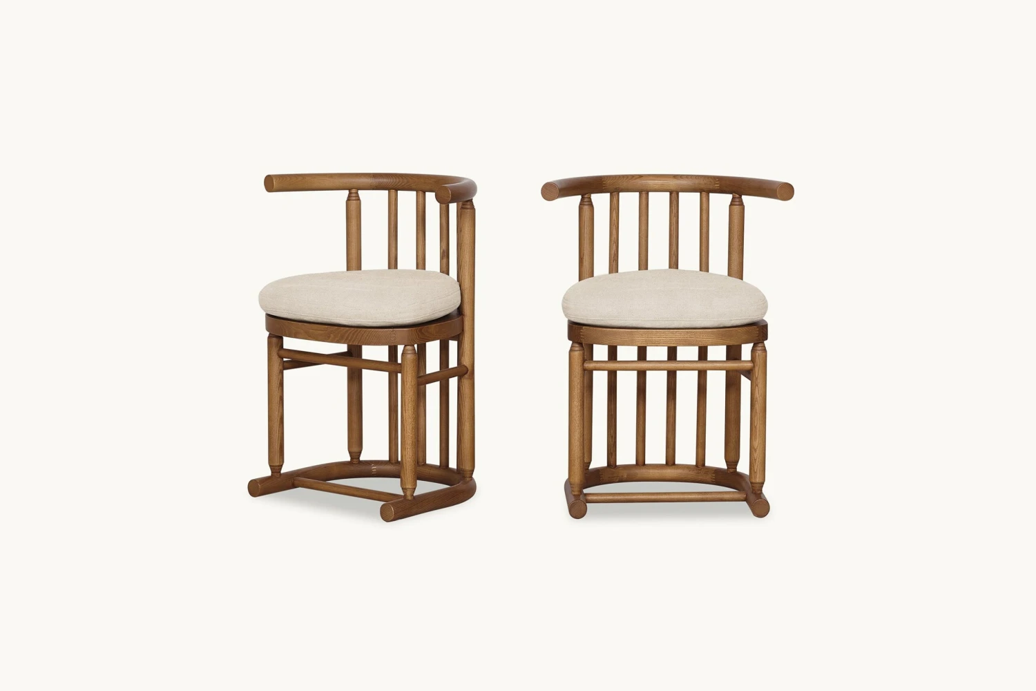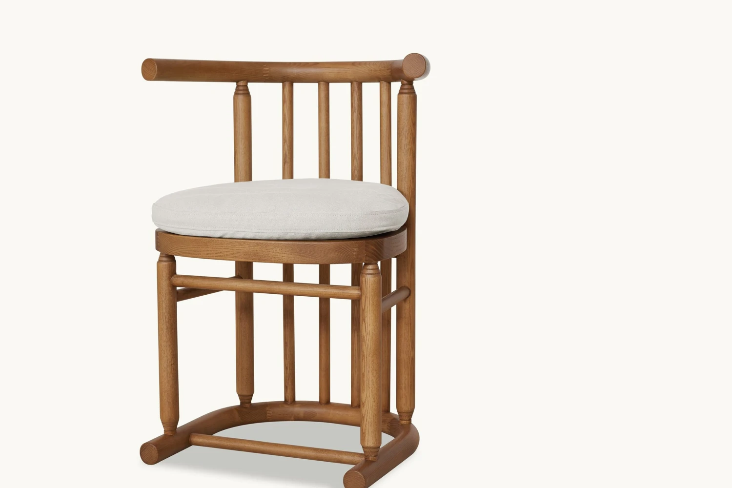 Inspired by the late Josef Hoffman’s Chair no. 729, Bene’s horseshoe top and base are vertically punctuated by rounded spindles, subtly carved at the end points and adorned with a fluffy slipcovered cushion for unexpected comfort.