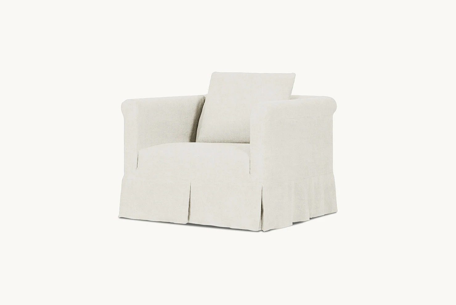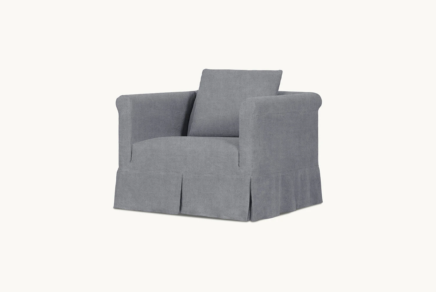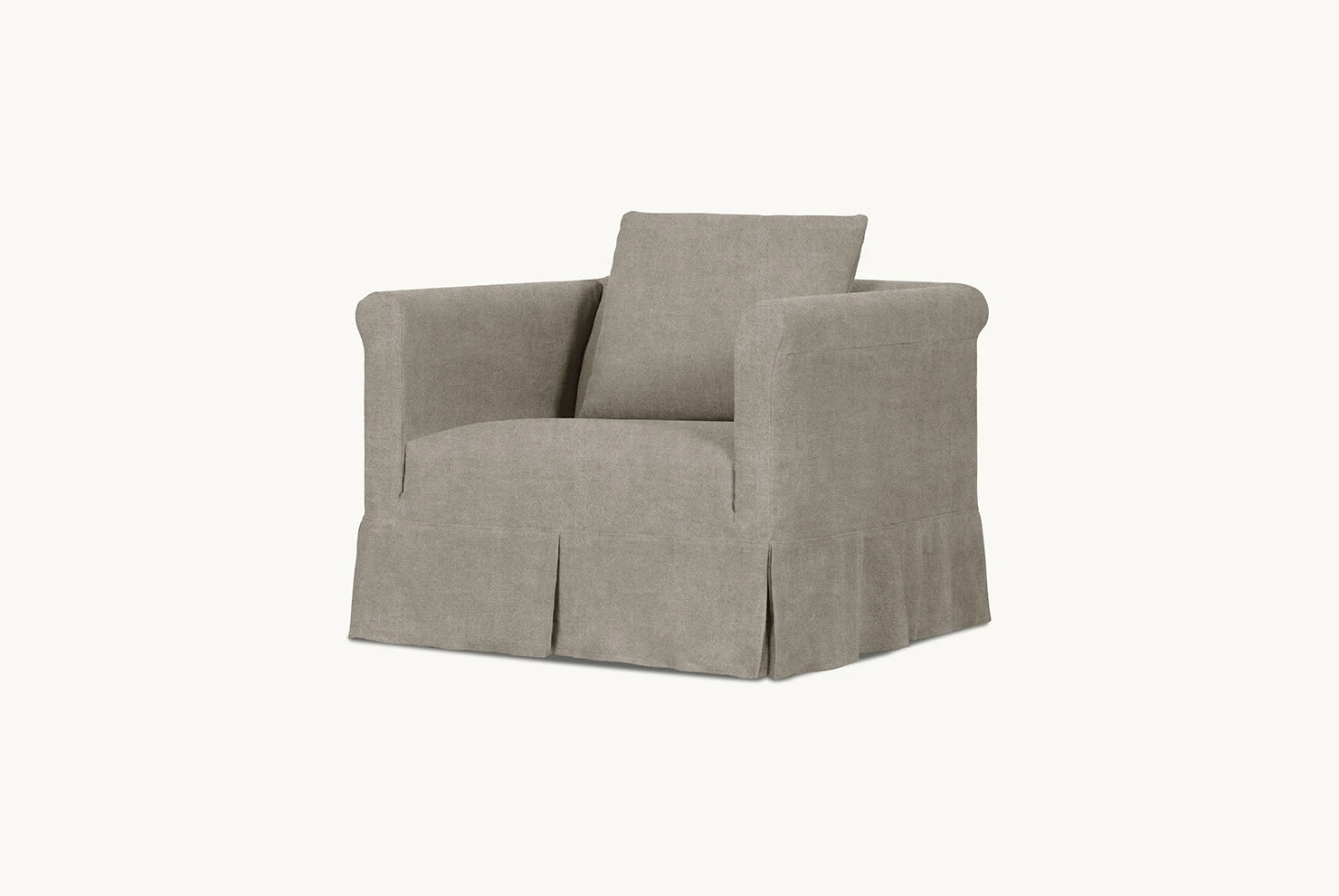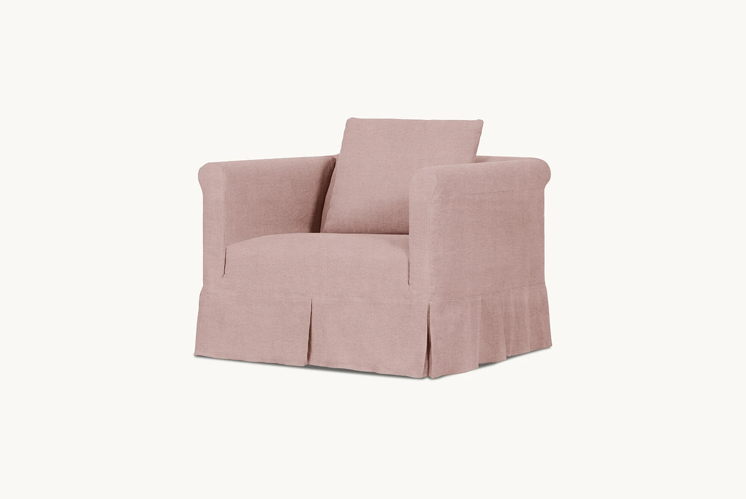 Playful and perky—Dalia’s supportive fixed seat, slim rolled arm, and wider-than-usual pleated skirt give a classic look a little modern zing.