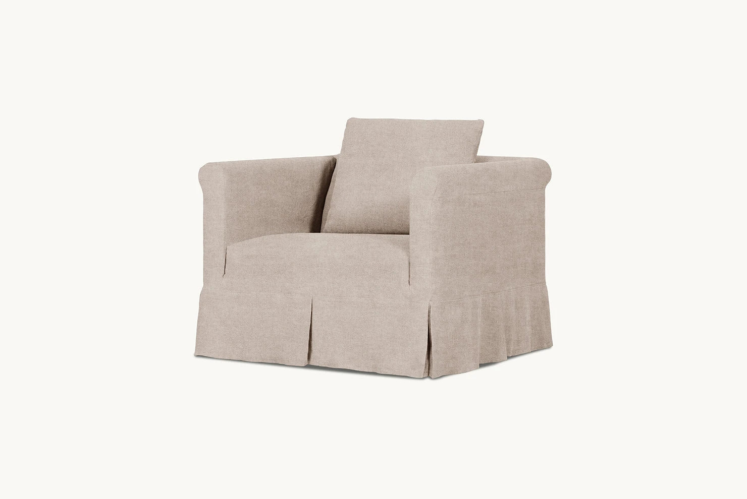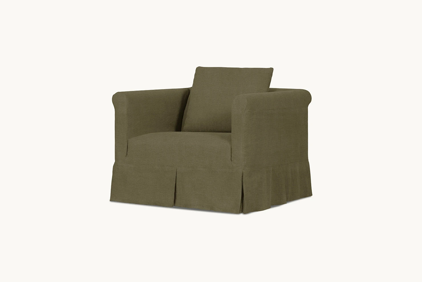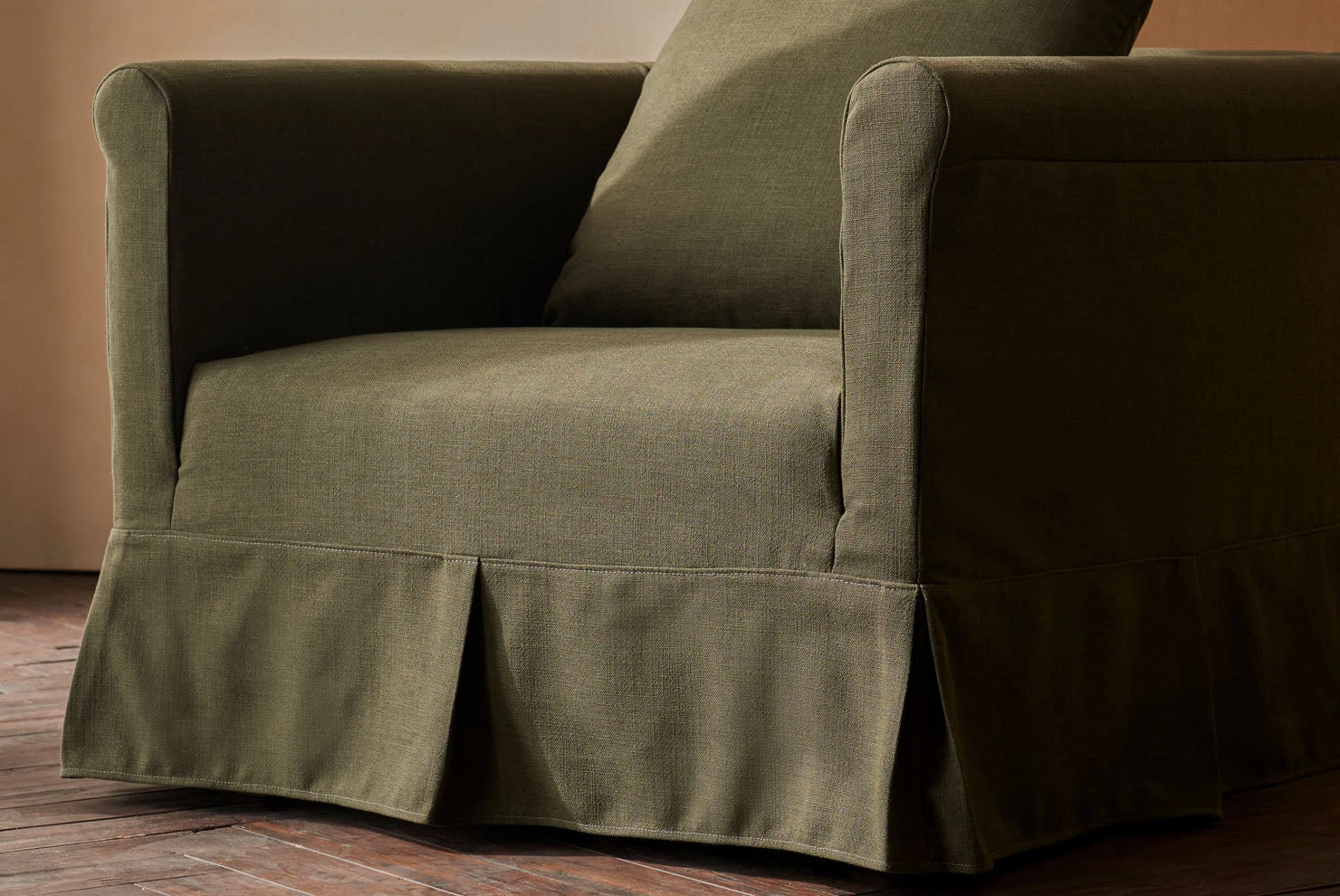 Playful and perky—Dalia’s supportive fixed seat, slim rolled arm, and wider-than-usual pleated skirt give a classic look a little modern zing.