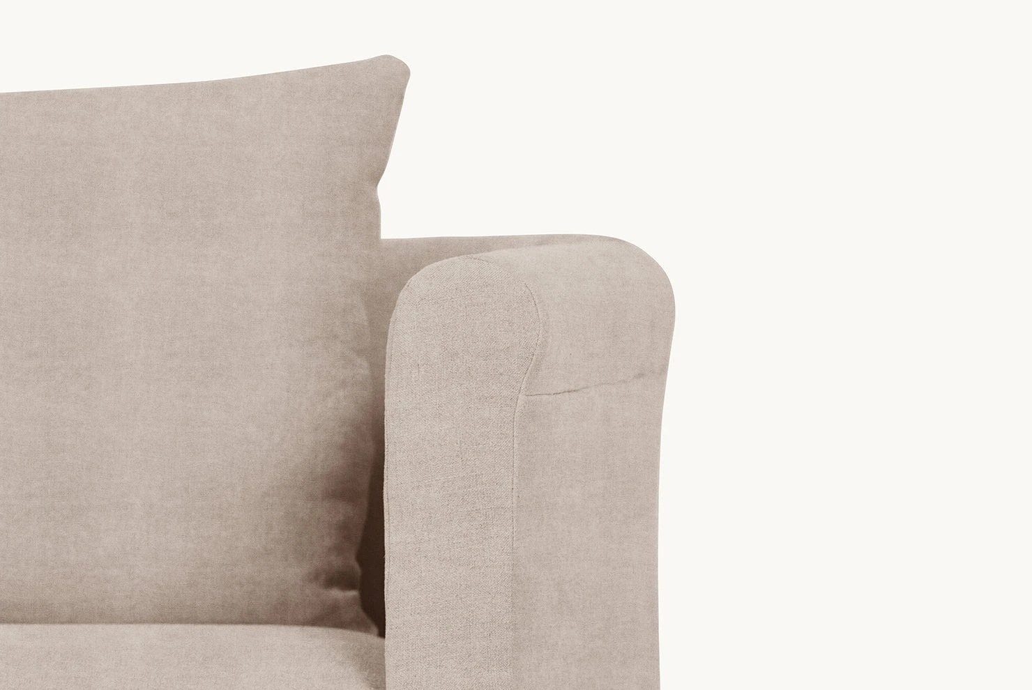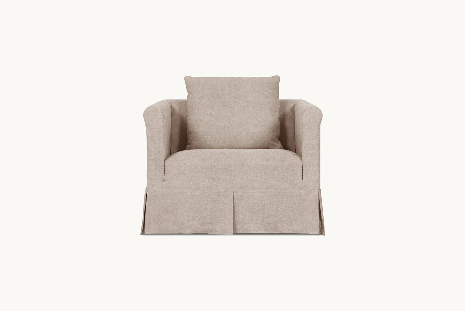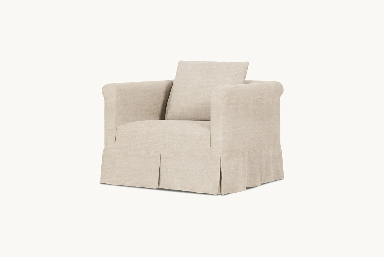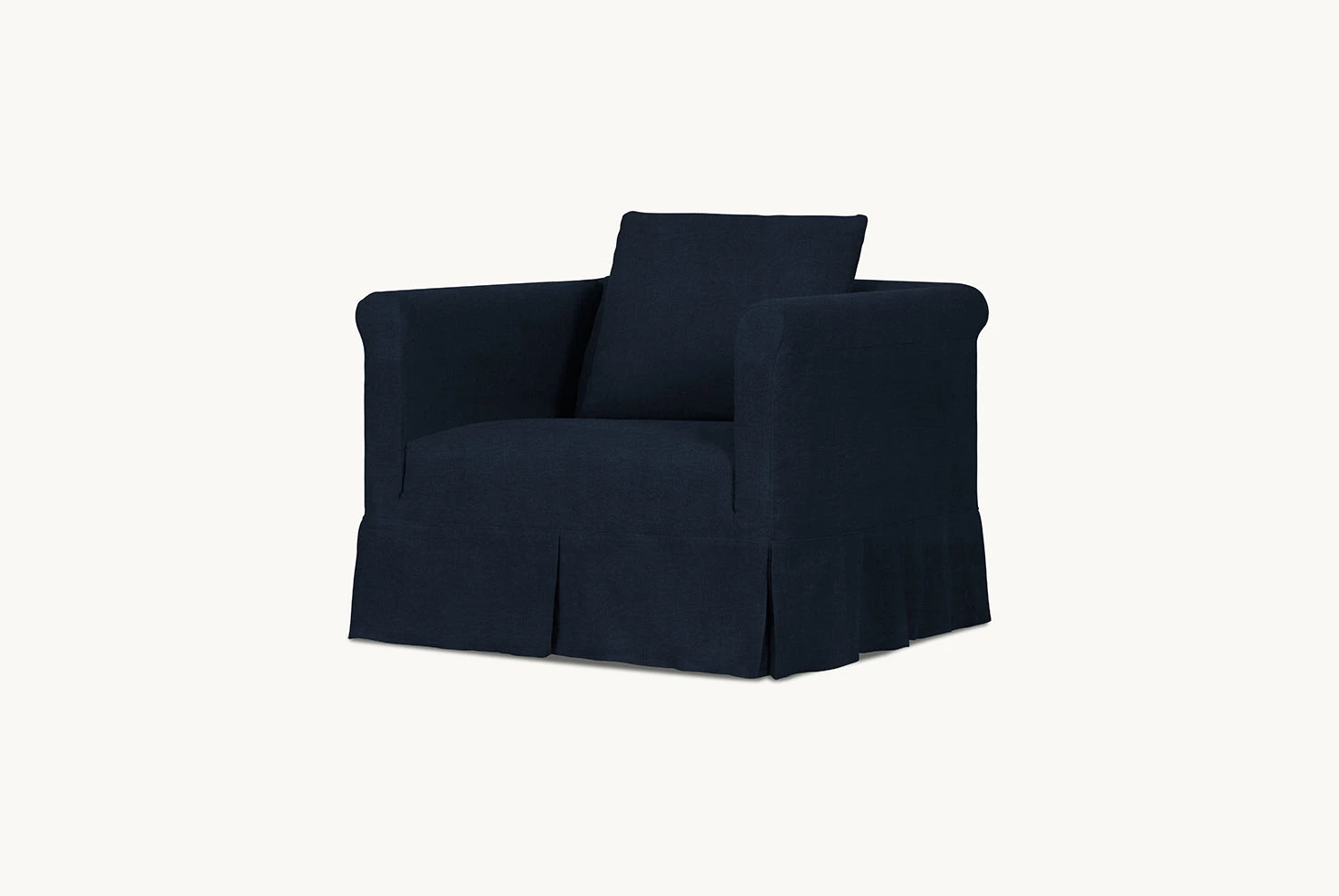 Playful and perky—Dalia’s supportive fixed seat, slim rolled arm, and wider-than-usual pleated skirt give a classic look a little modern zing.