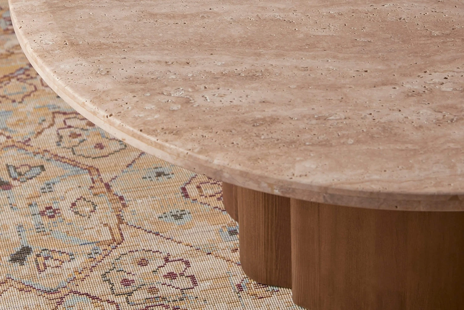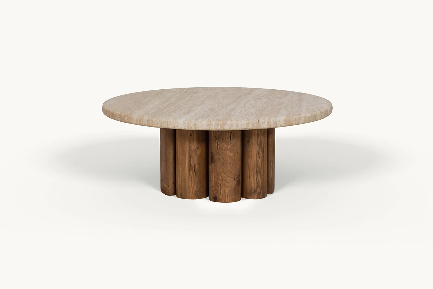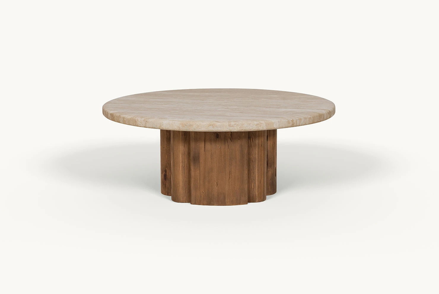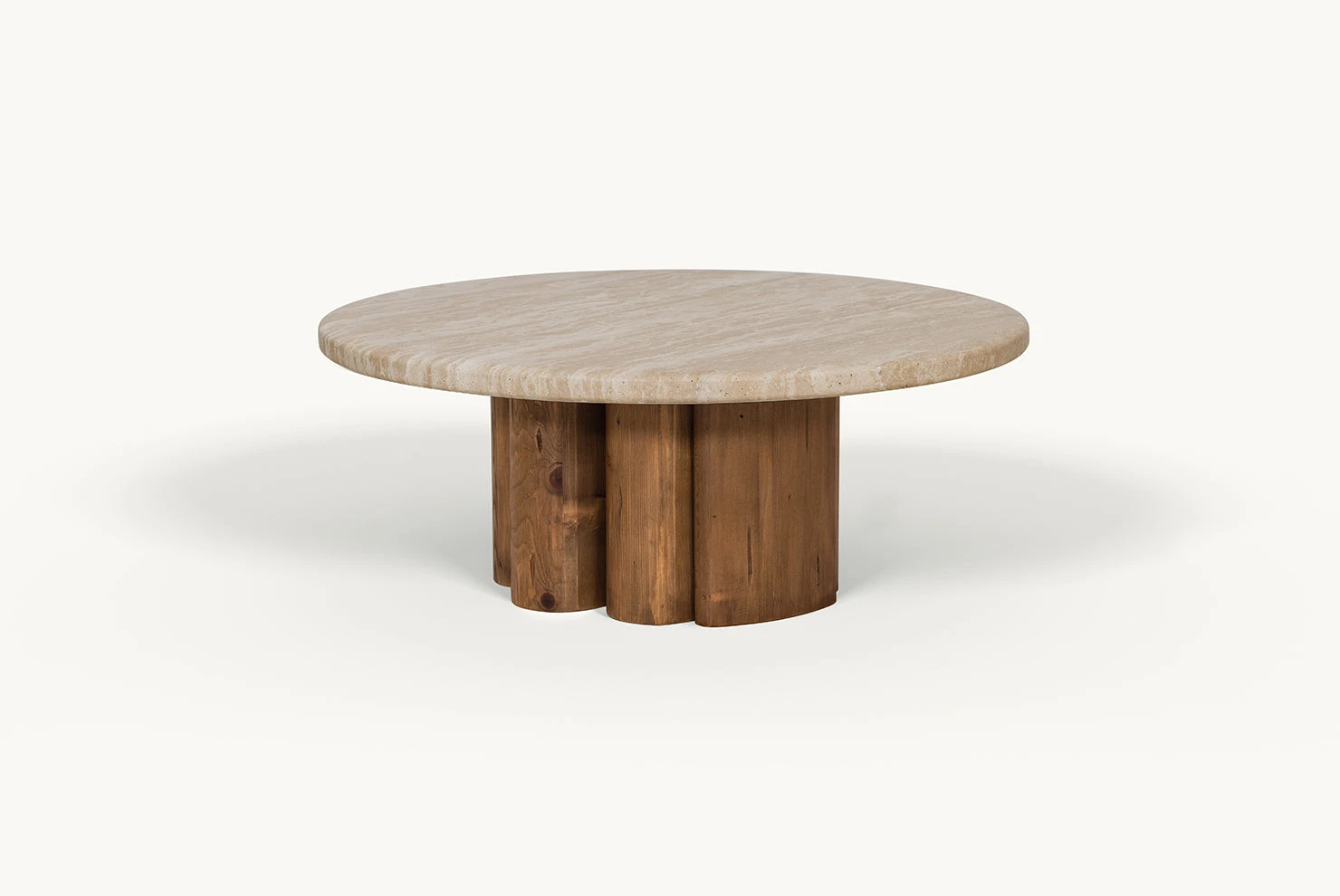 Enzo feels significant. The nuanced coloration, vein pattern, and craggy pitting are unique to every piece of Turkish travertine, mapping out the centuries-long journey of its formation—no two tabletops will be the same. With a sculptural pedestal base of reclaimed pine, Enzo distills generations of character into one moment of impactful design.