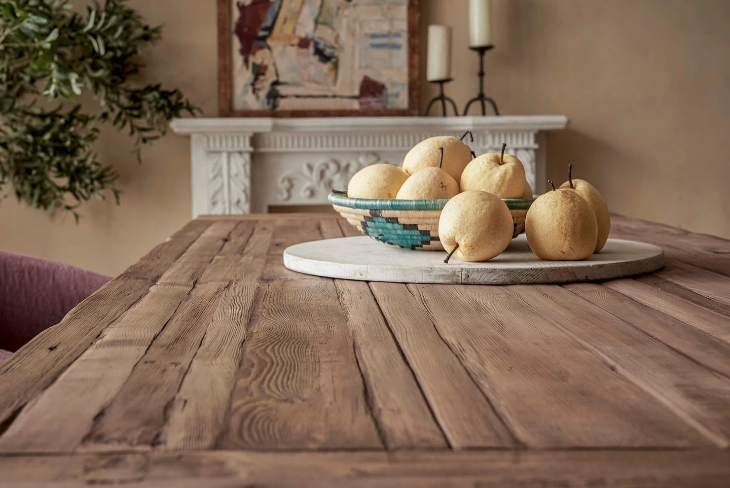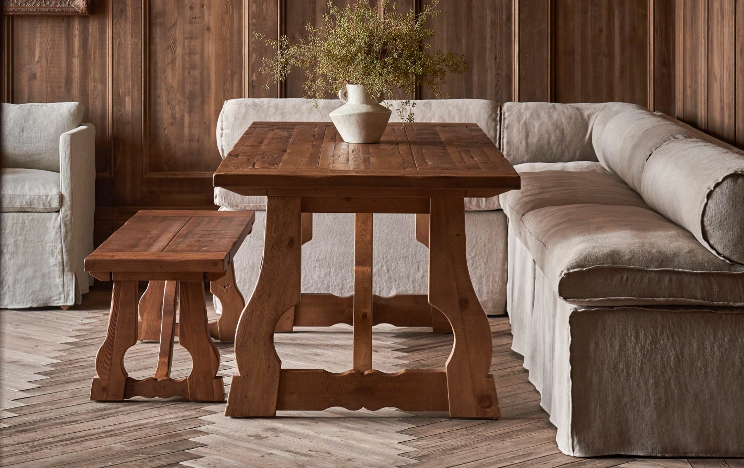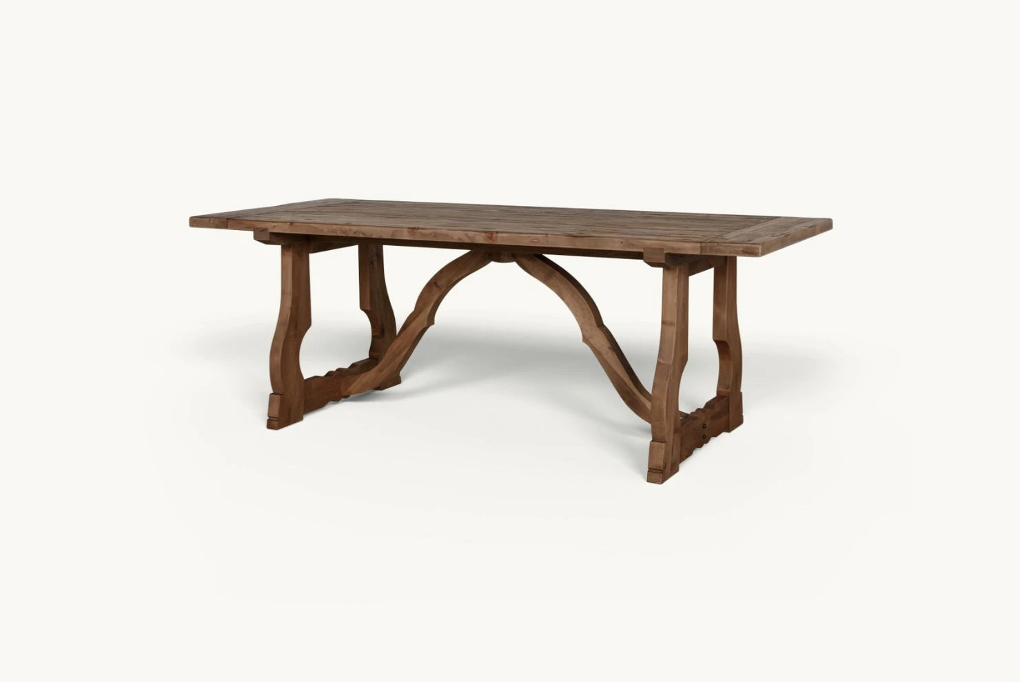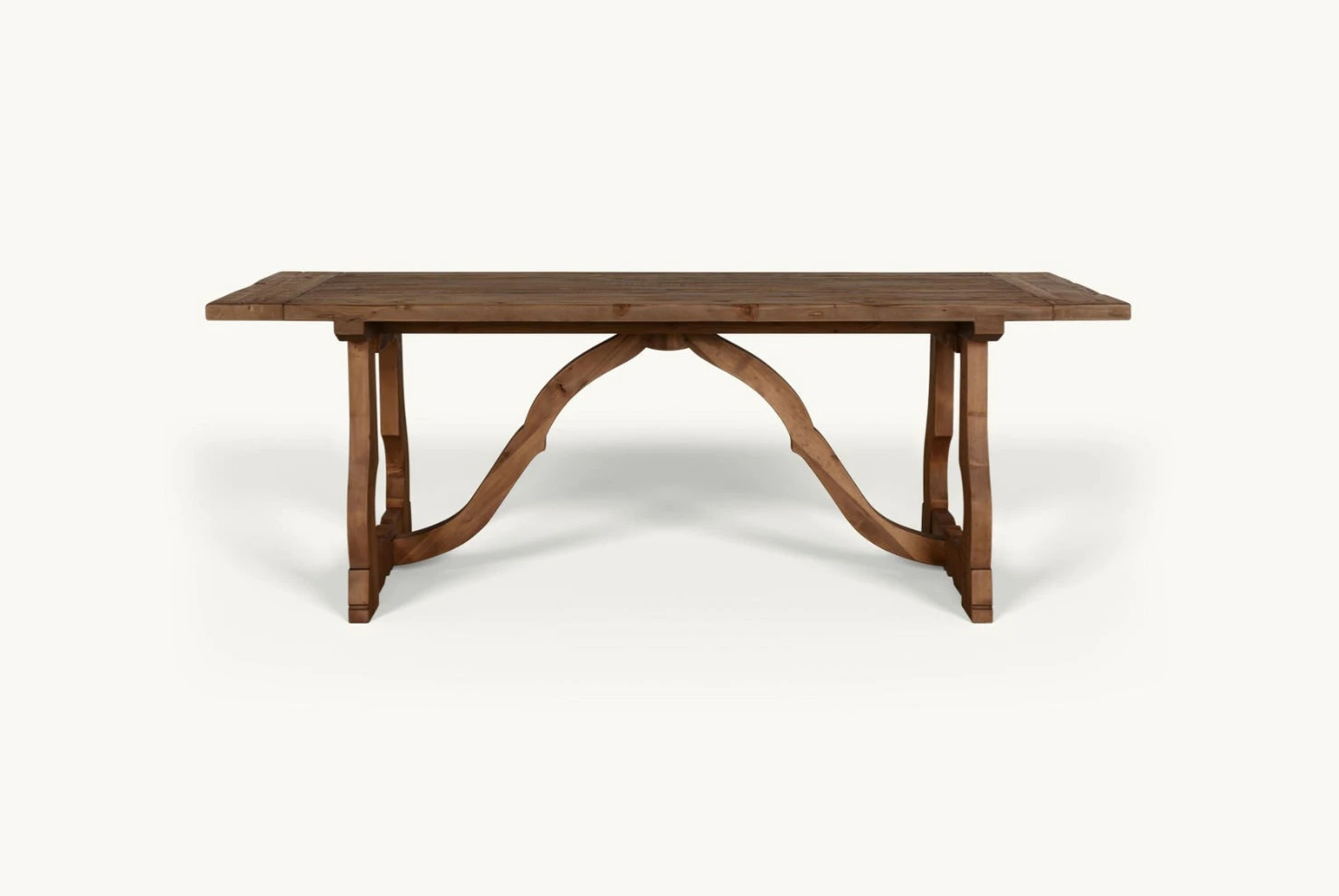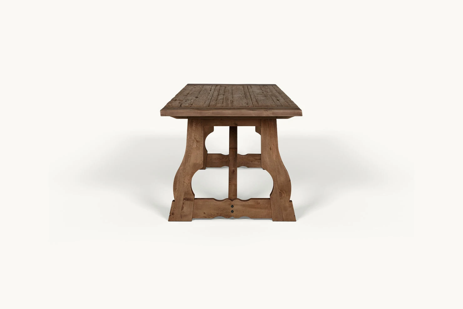 An exquisitely carved revitalization of the rustic, 18th-century Spanish dining tables that history has immortalized. Crafted entirely from storied reclaimed pine, Leona is a focal point that vibrates with the tales of its prior life.