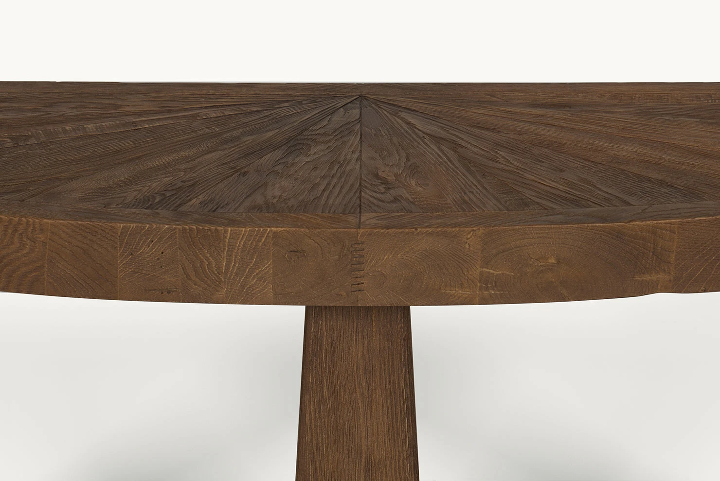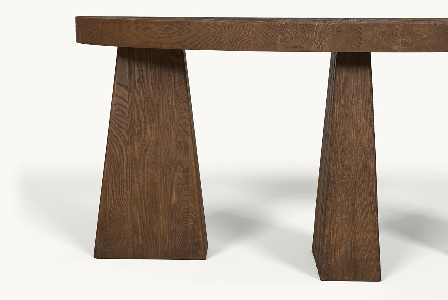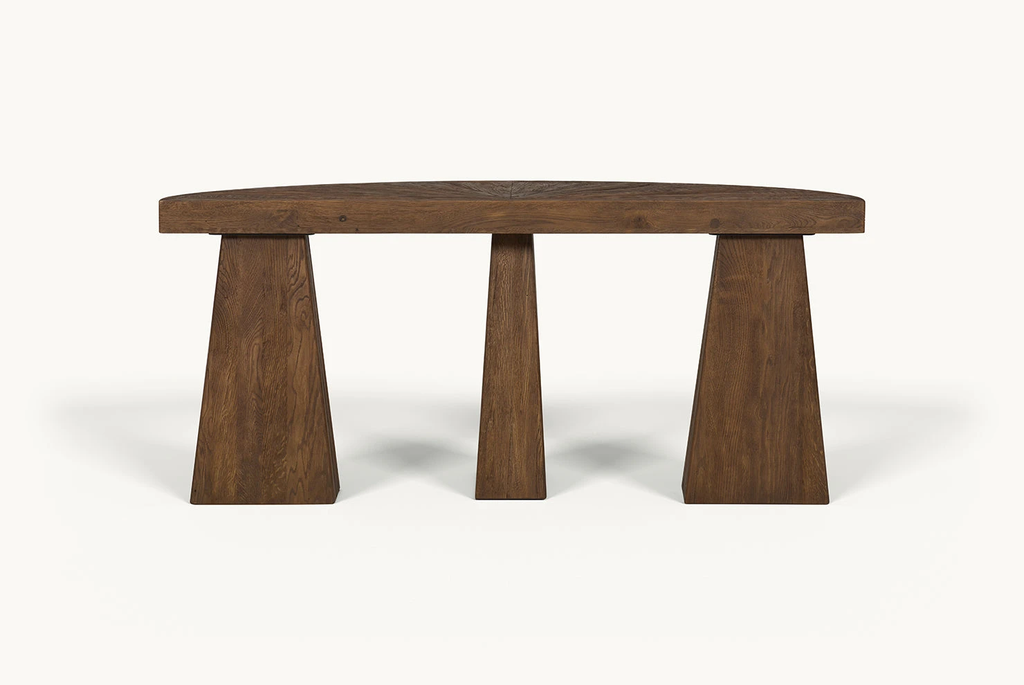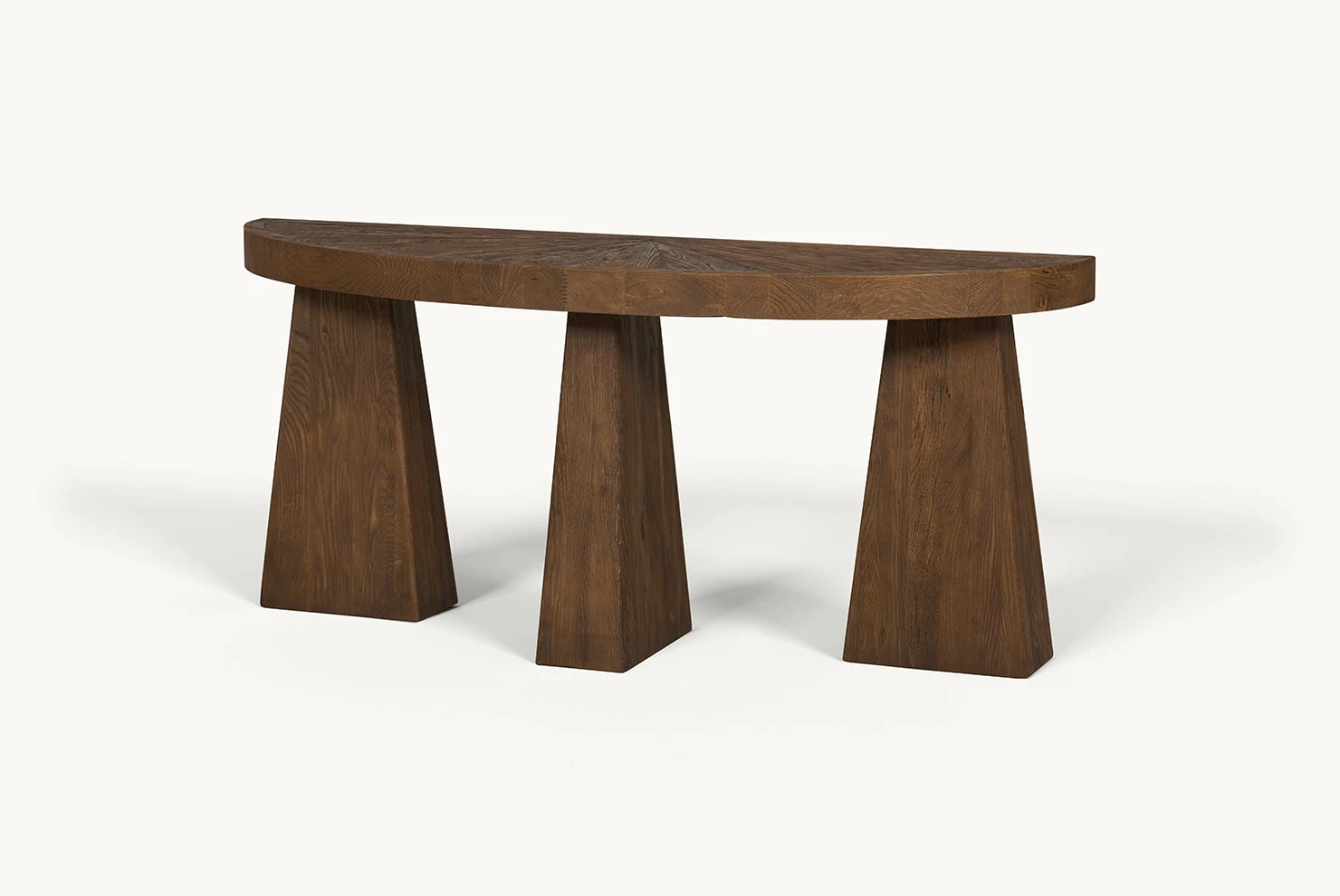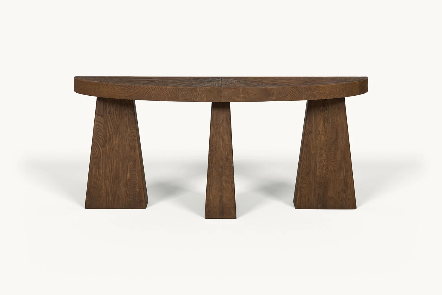 A sculptural, demi-lune console made from reclaimed oak, featuring stunning triangular inlays on the tabletop and brutalist-inspired, chunky legs.