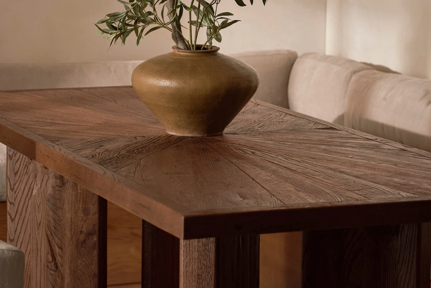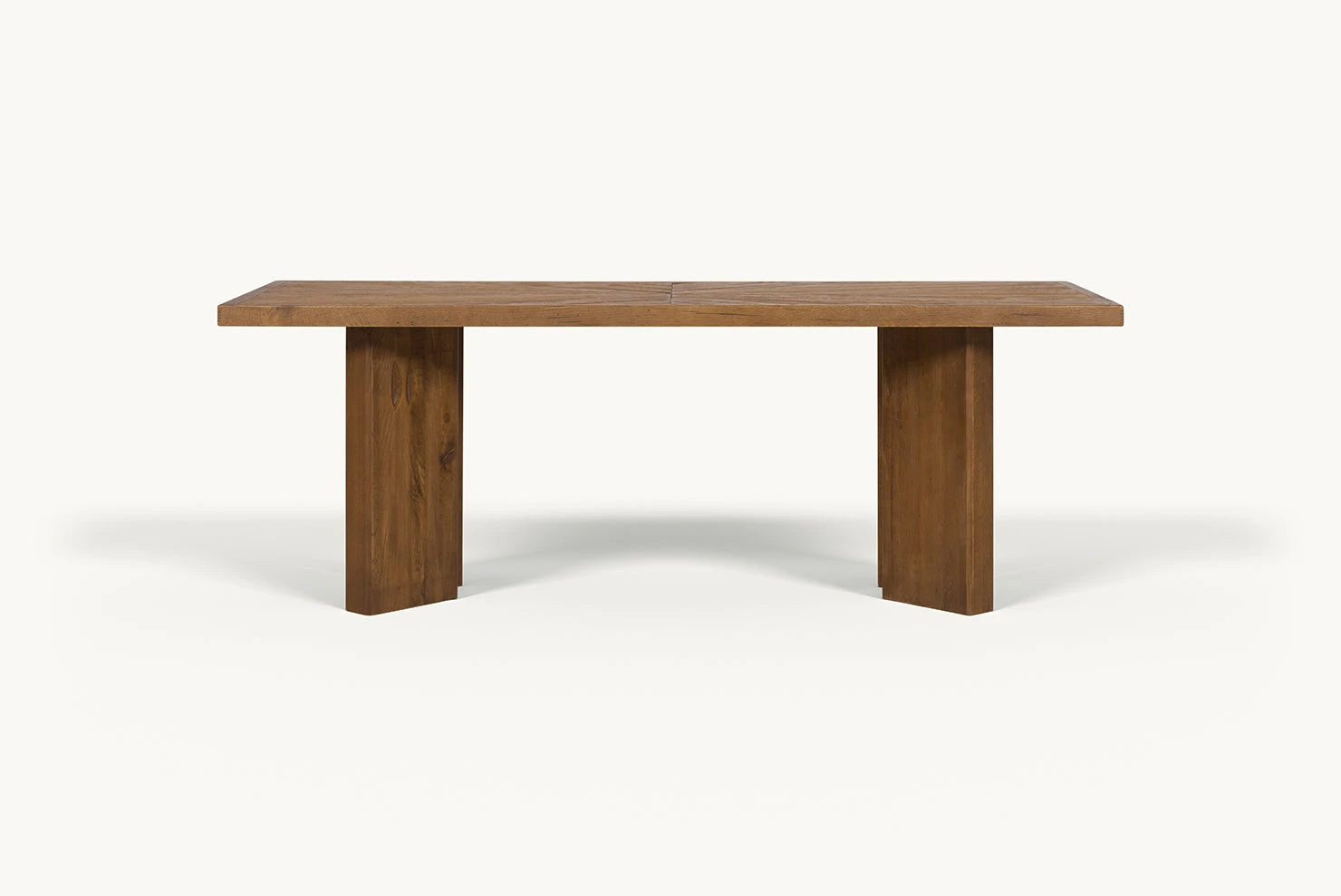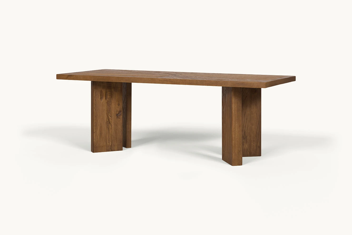 A sculptural dining table made from reclaimed oak, featuring stunning triangular inlays on the tabletop and brutalist-inspired, chunky tapered legs.