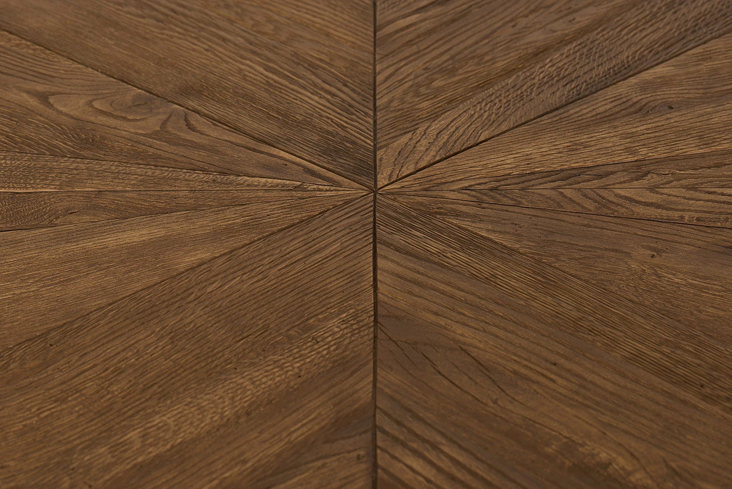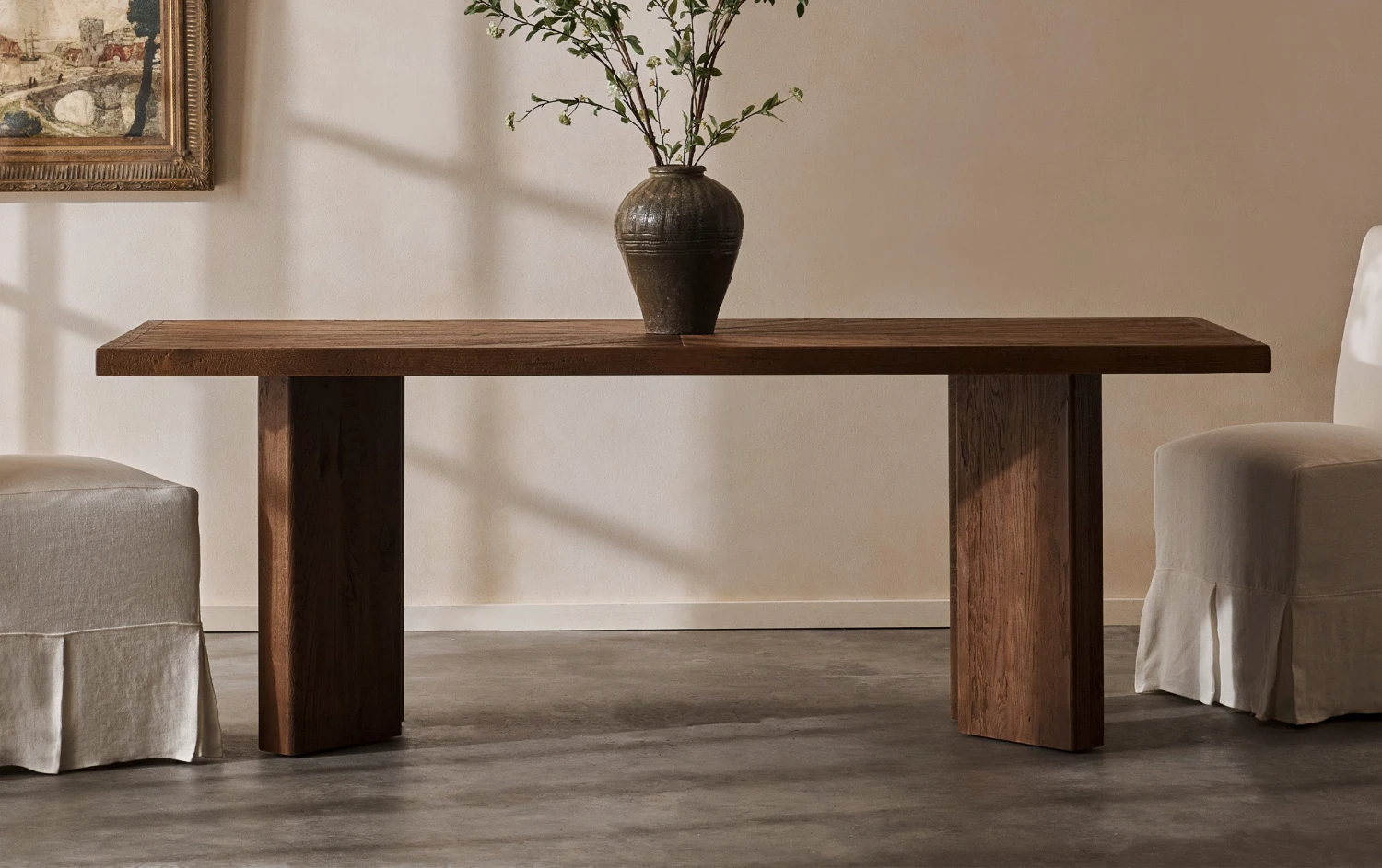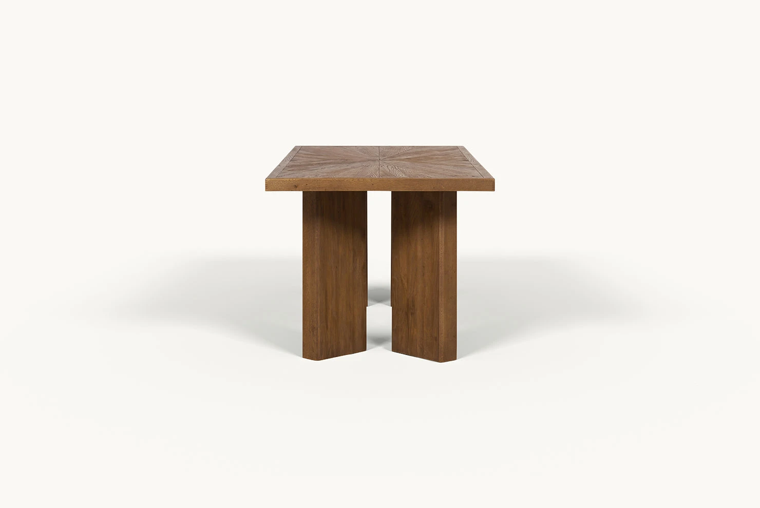 A sculptural dining table made from reclaimed oak, featuring stunning triangular inlays on the tabletop and brutalist-inspired, chunky tapered legs.