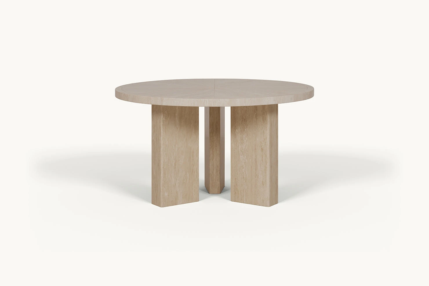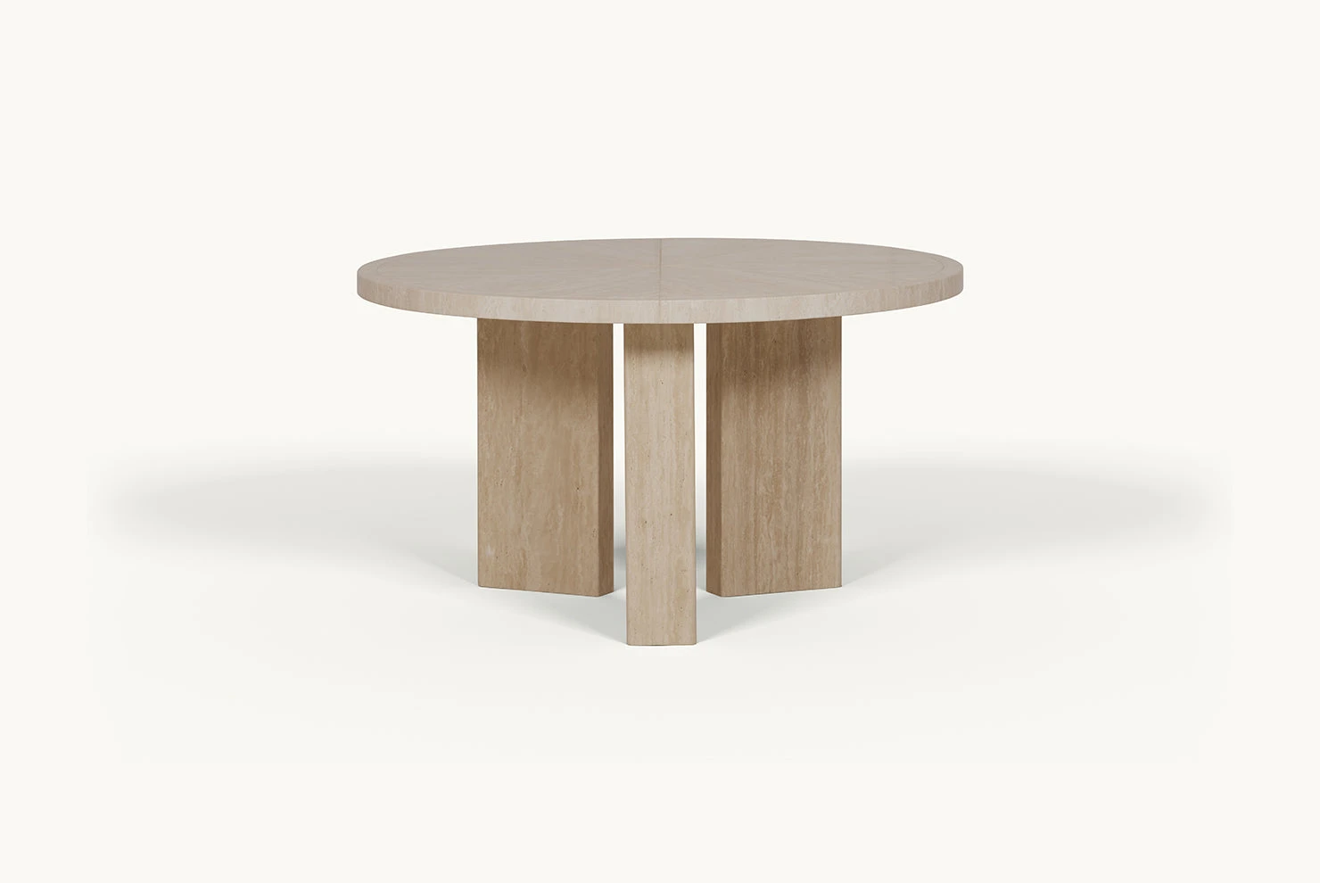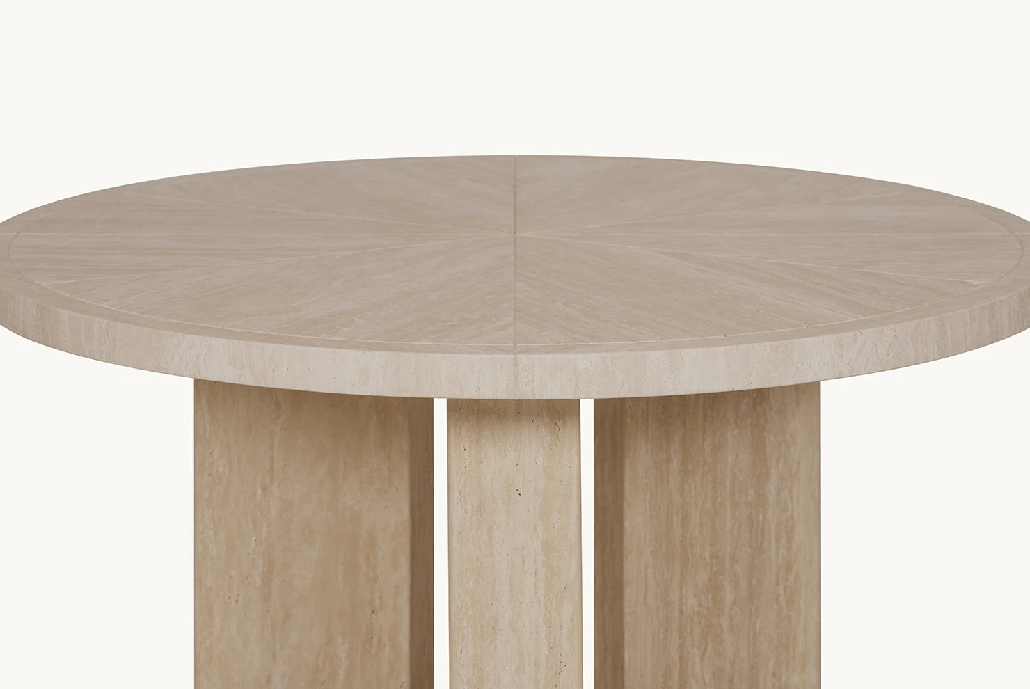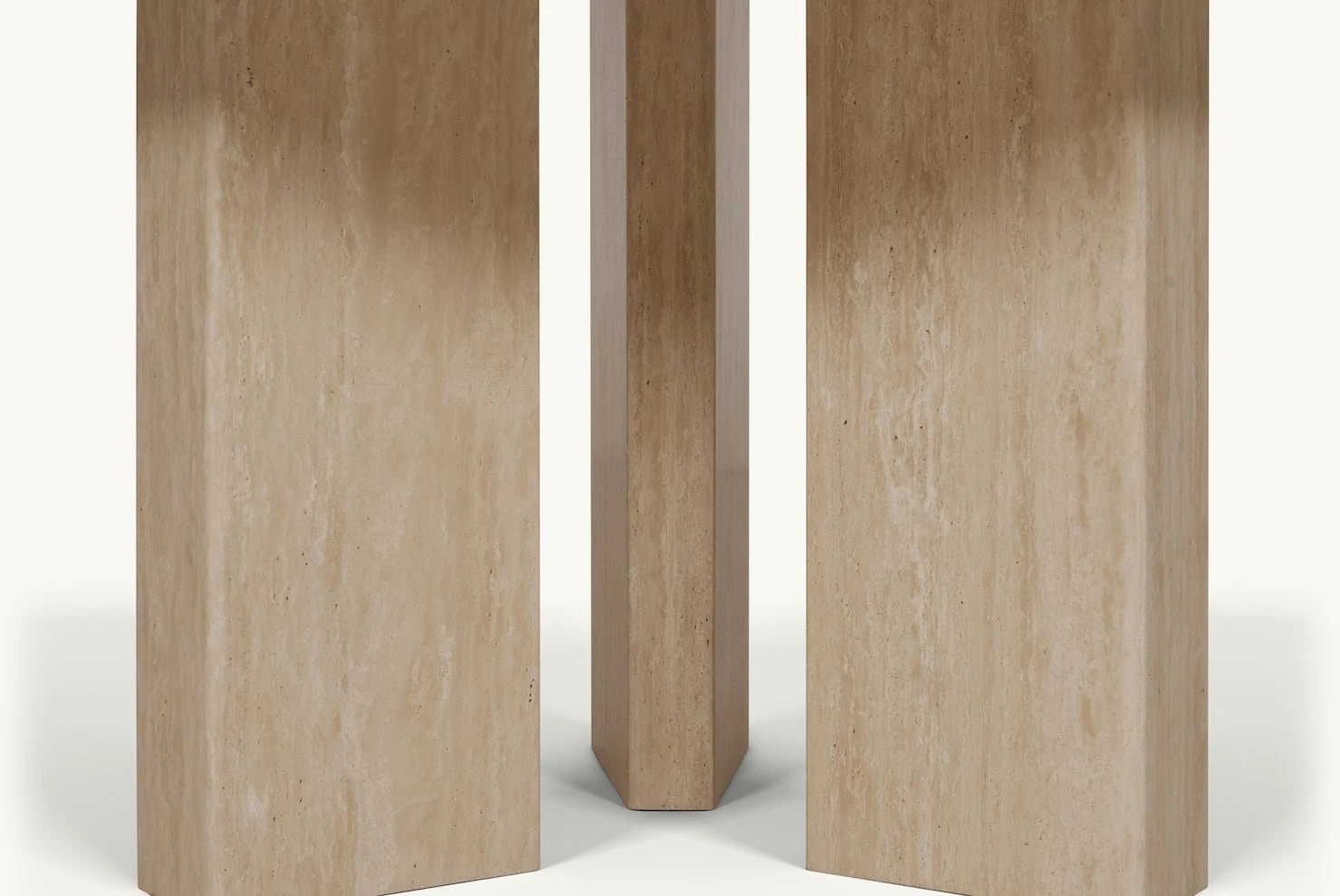 An exceedingly simple shape—a circle with three legs—until viewed up close. The etched, sundial-like carving in its tabletop and chunky, tapered legs—all hand-cut from reclaimed oak or riverbed-like travertine, and all assembled to create beautifully detailed simplicity.