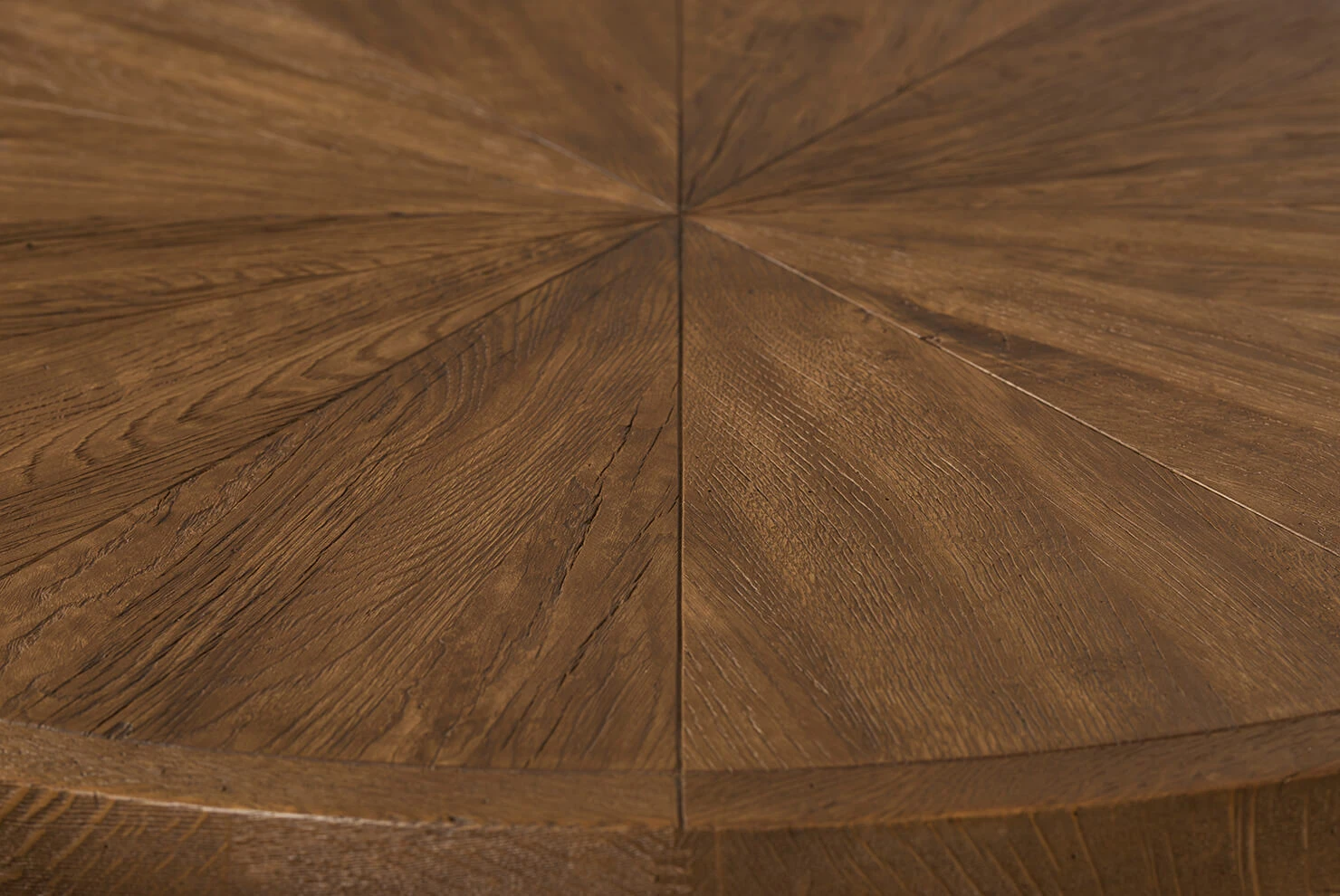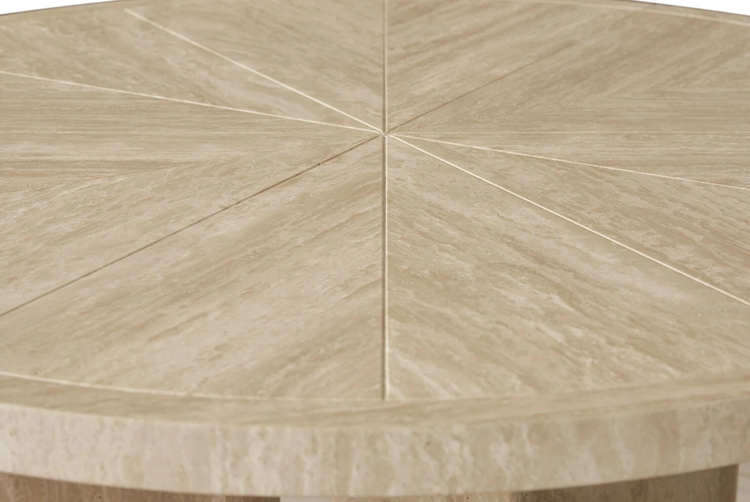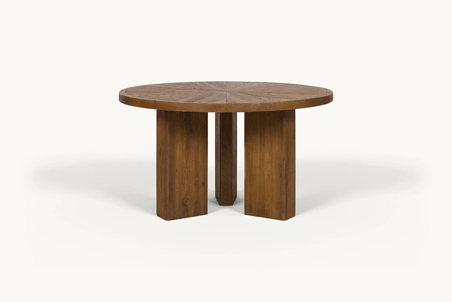 An exceedingly simple shape—a circle with three legs—until viewed up close. The etched, sundial-like carving in its tabletop and chunky, tapered legs—all hand-cut from reclaimed oak or riverbed-like travertine, and all assembled to create beautifully detailed simplicity.