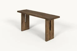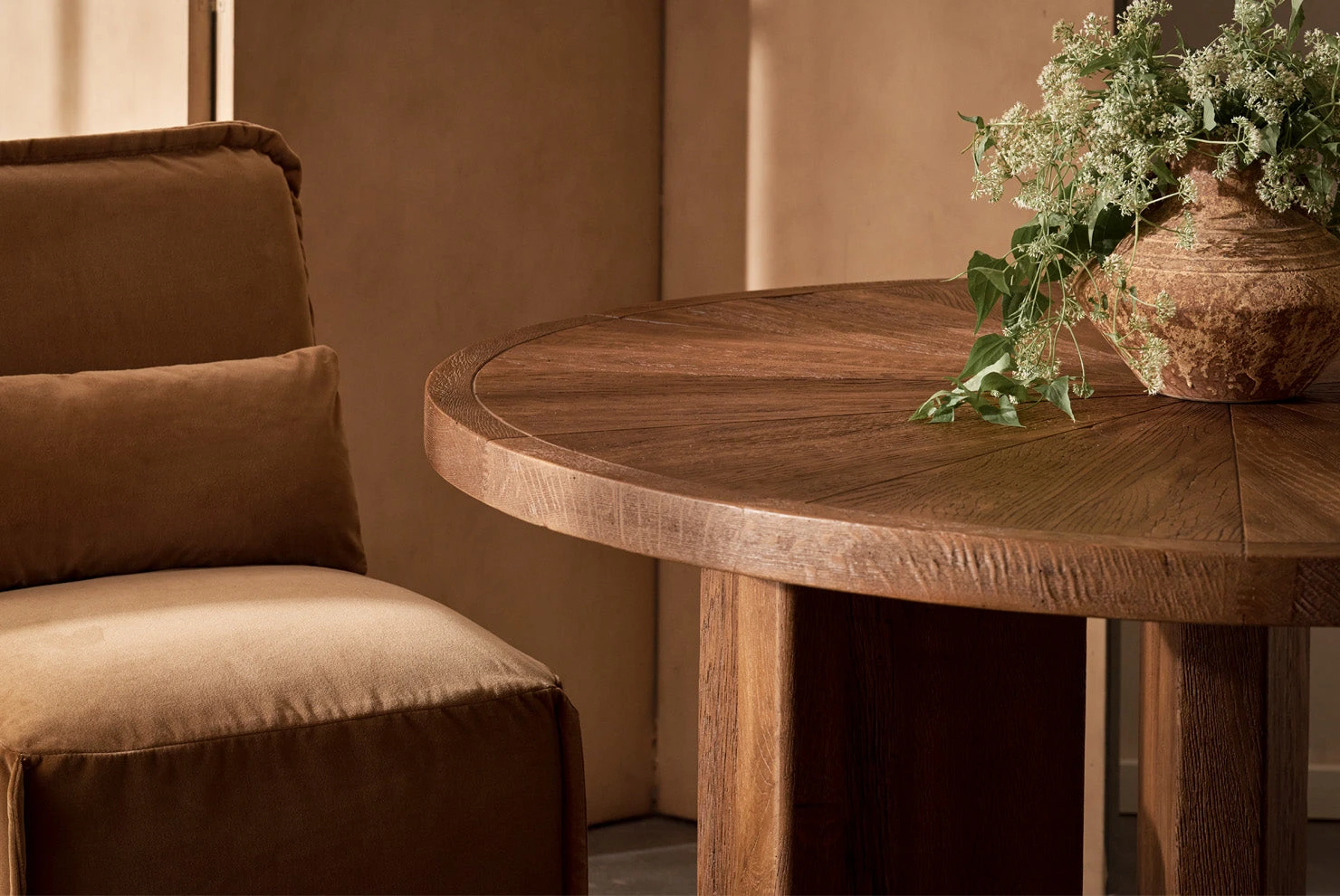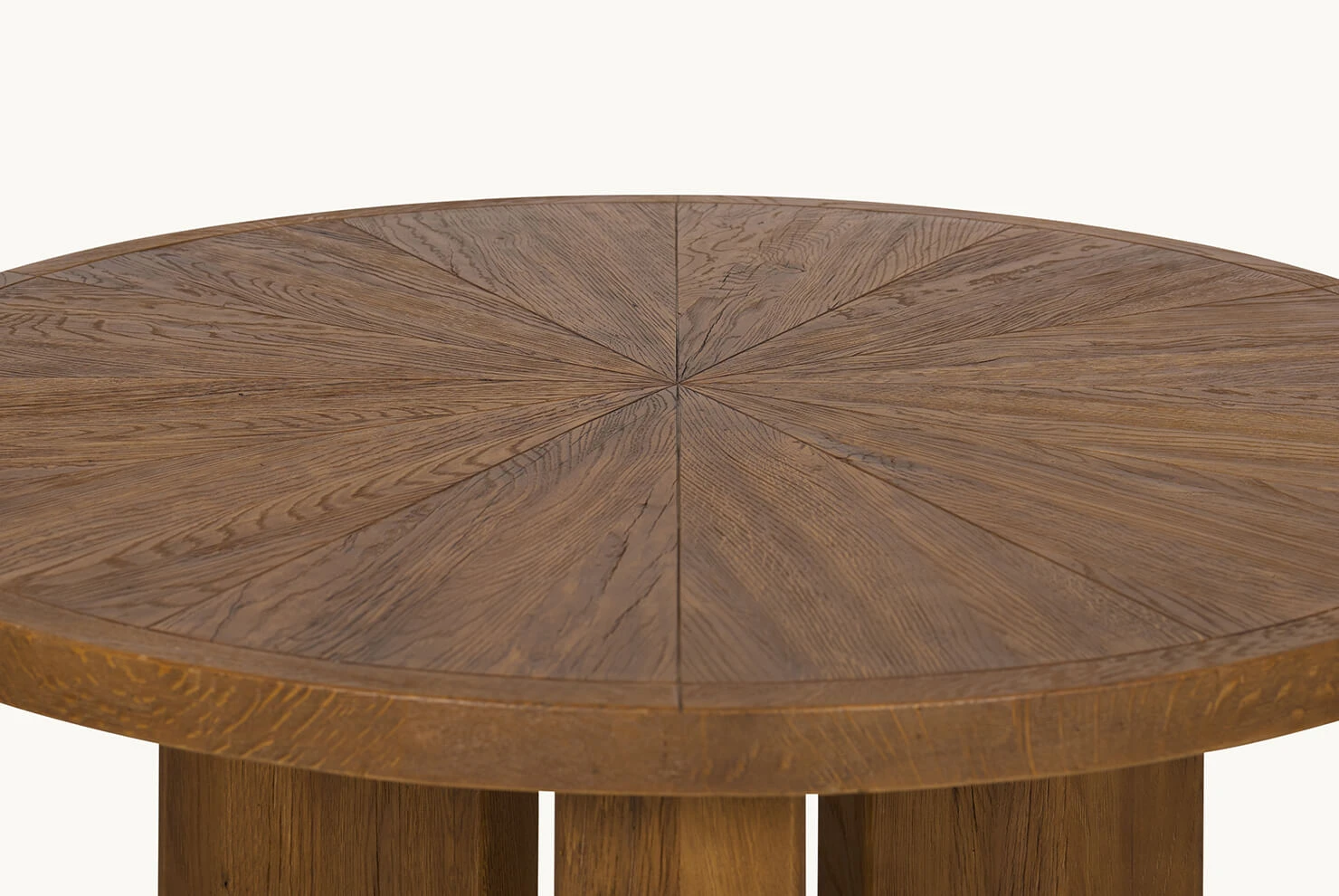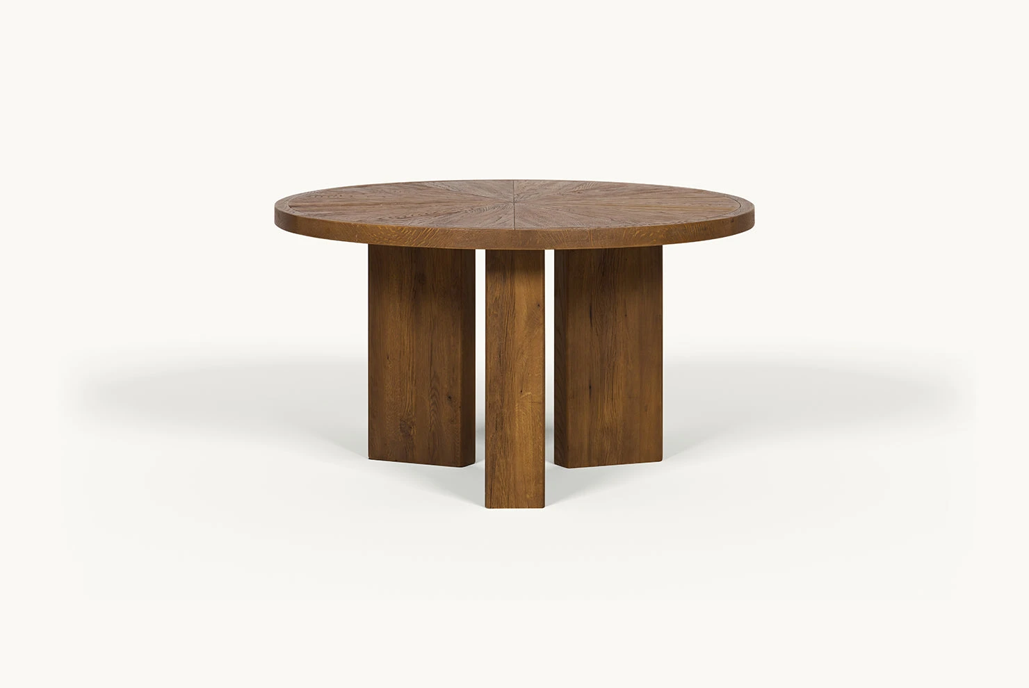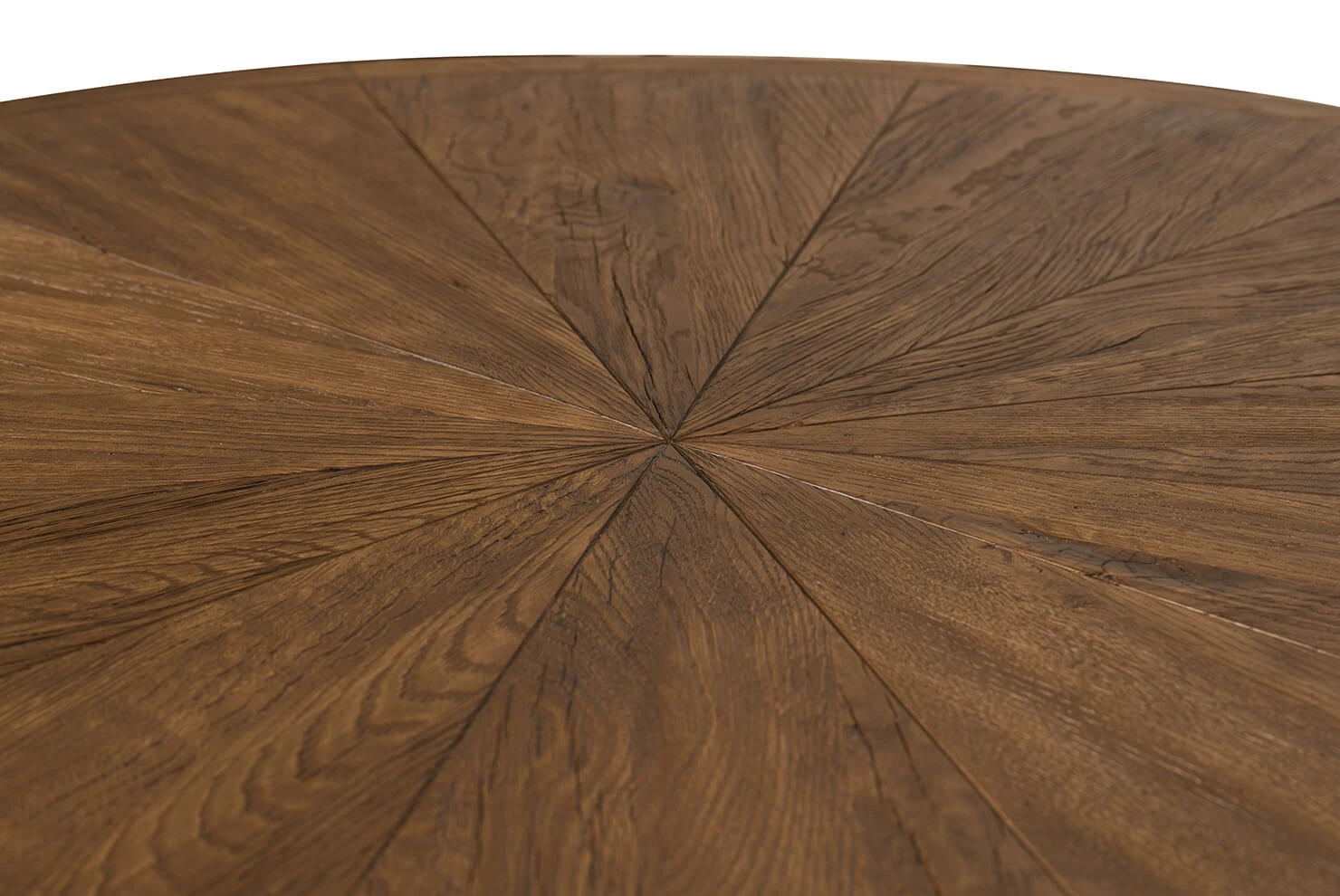 An exceedingly simple shape—a circle with three legs—until viewed up close. The etched, sundial-like carving in its tabletop and chunky, tapered legs—all hand-cut from reclaimed oak or riverbed-like travertine, and all assembled to create beautifully detailed simplicity.